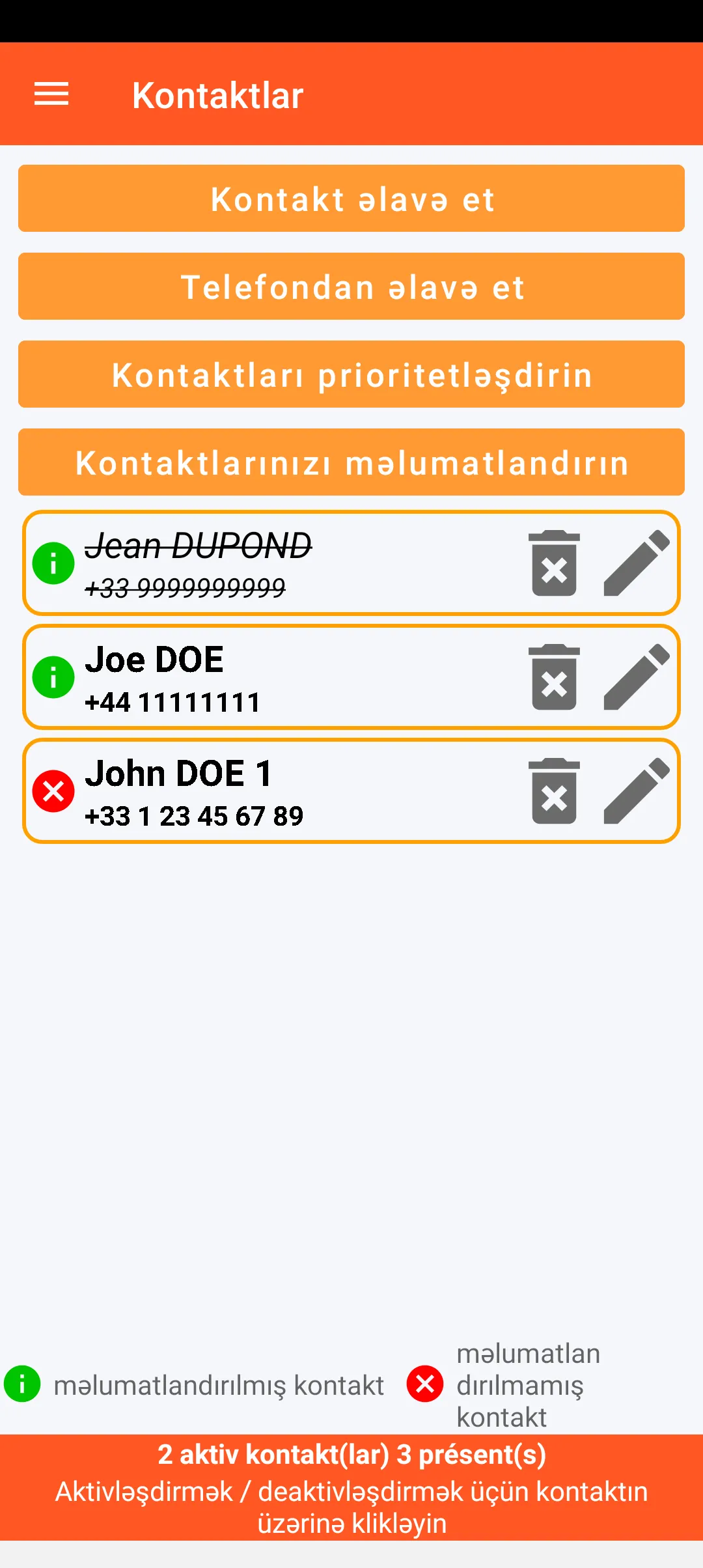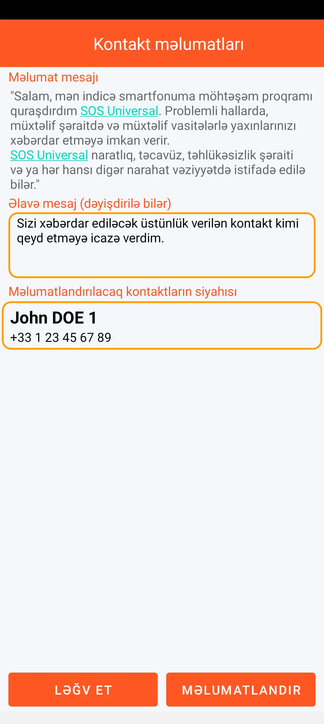 Smartfonunuzda mövcud olan kontaktlardan xəbərdar ediləcək etibarlı şəxsləri təyin edə bilərsiniz. Bu şəxslər prioritetləşdirilə və xəbərdarlıq mesajı ala biləcəkləri barədə məlumatlandırıla bilərlər. Hər bir kontakt müvəqqəti olaraq deaktiv edilə bilər.