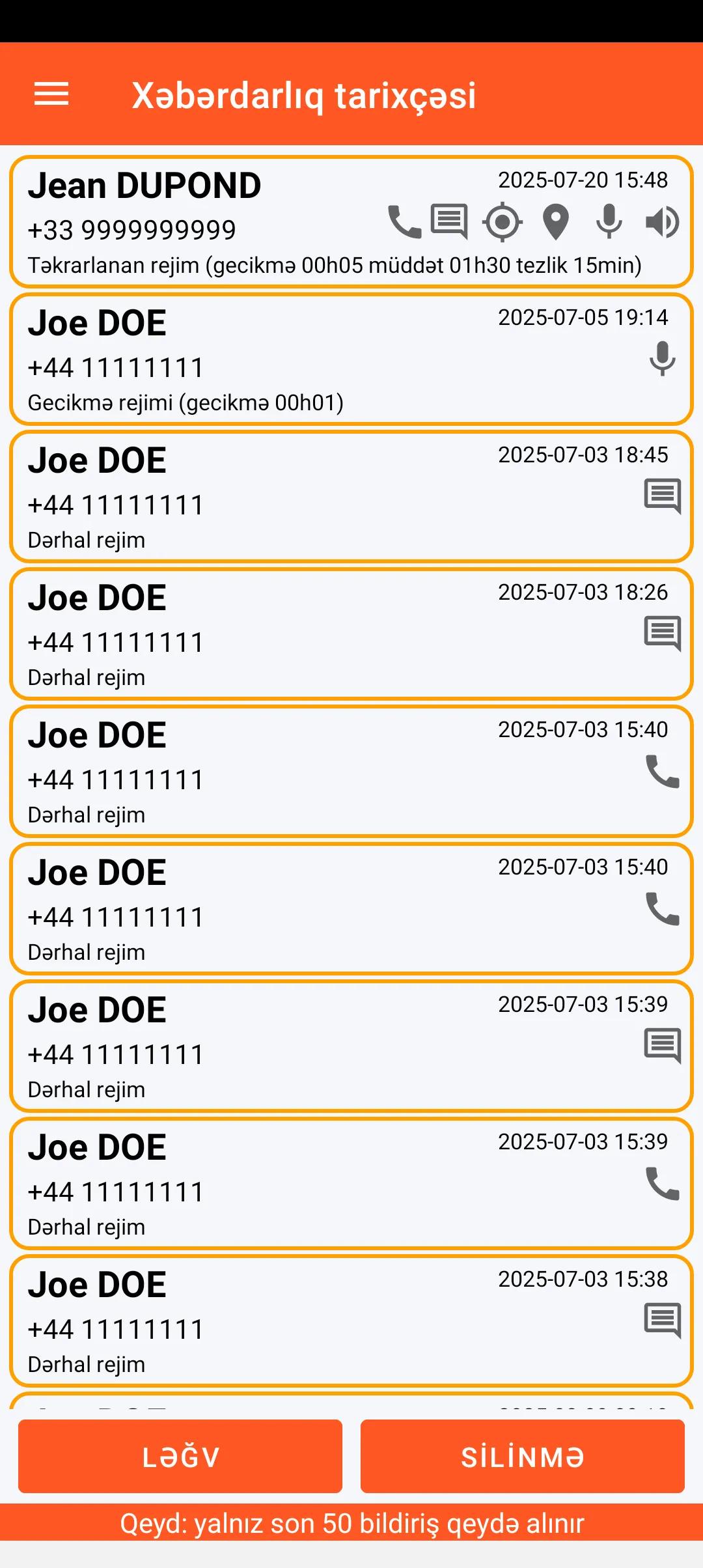 Son 50 göndərilən bildiriş bütün xüsusiyyətləri (xəbərdar edilmiş kontaktın adı, tarixi və vaxtı, habelə məzmunu və bildiriş rejimi) ilə tarixçədə saxlanılır.