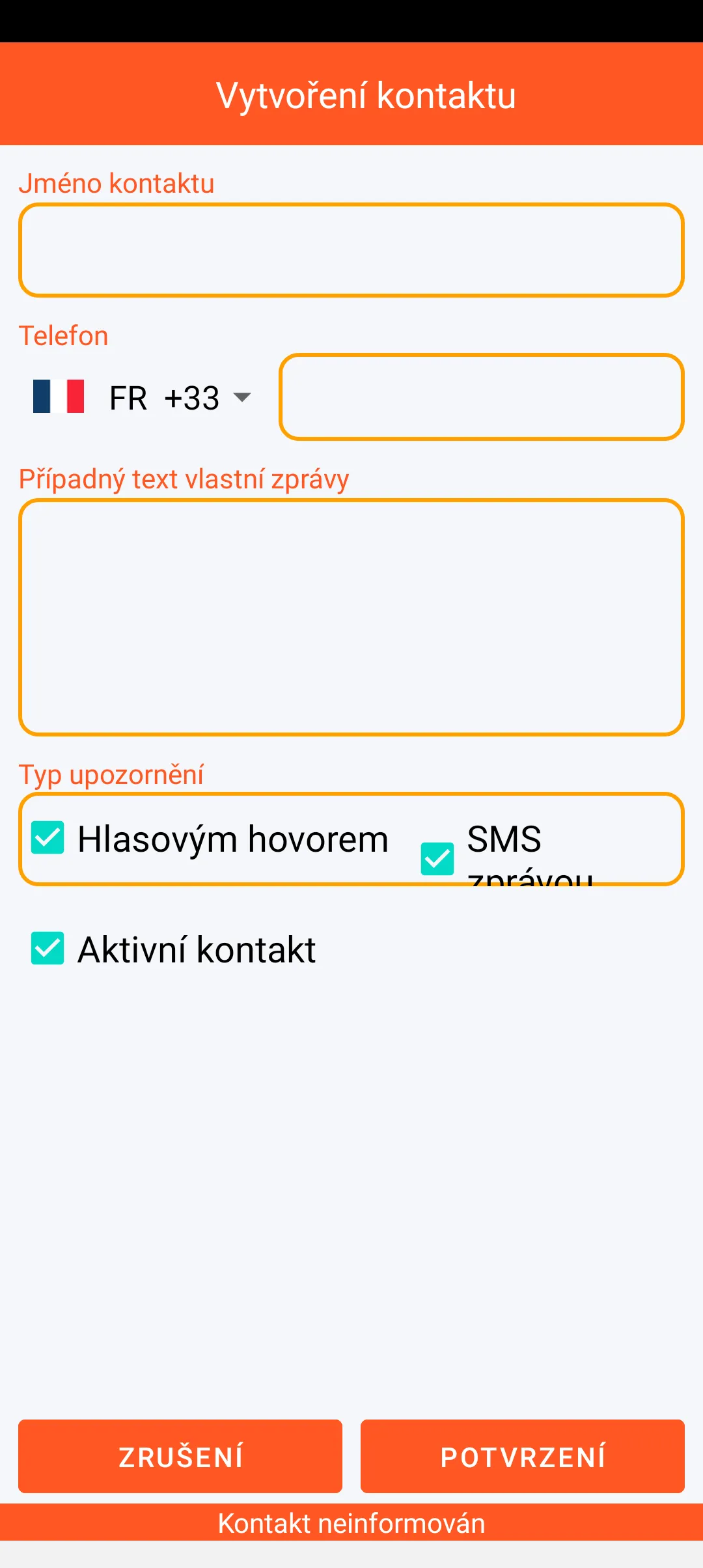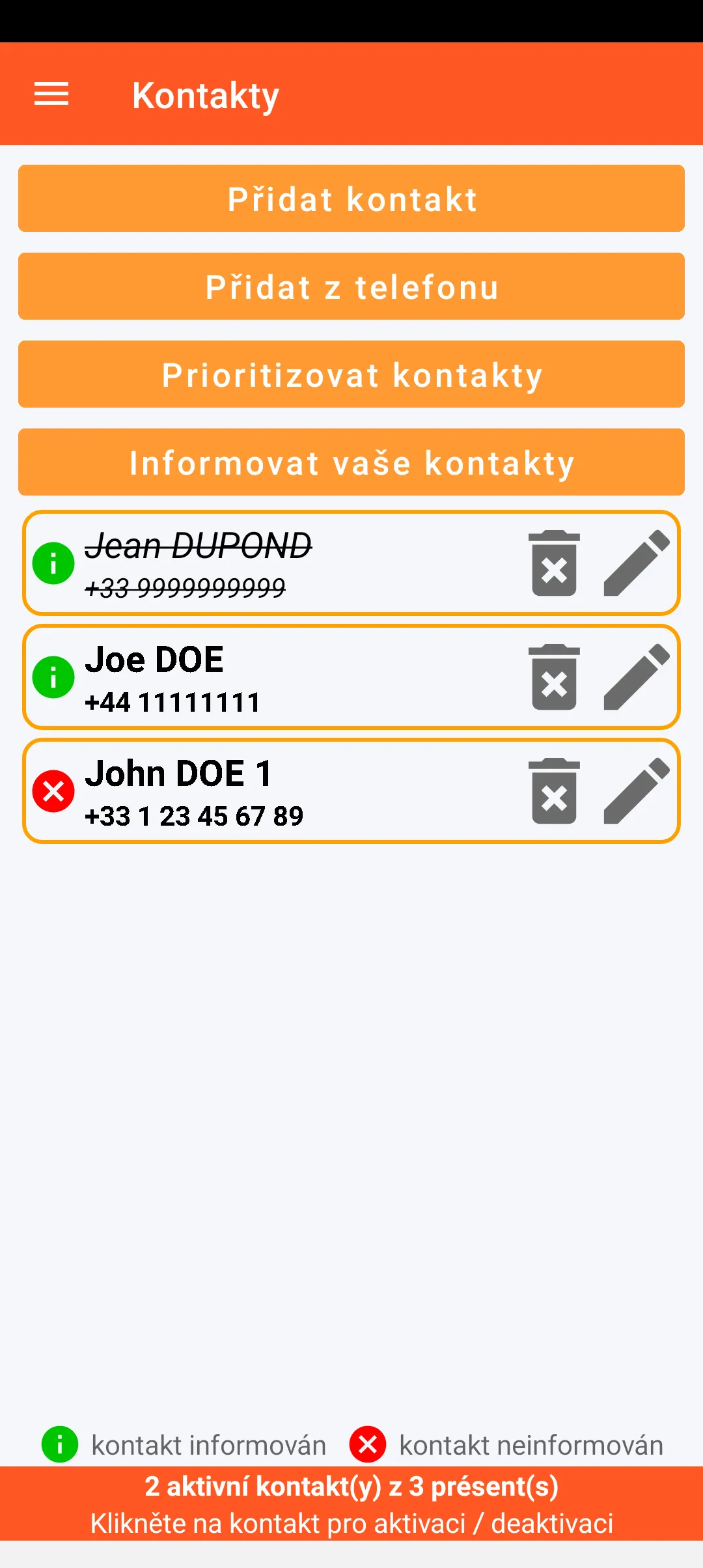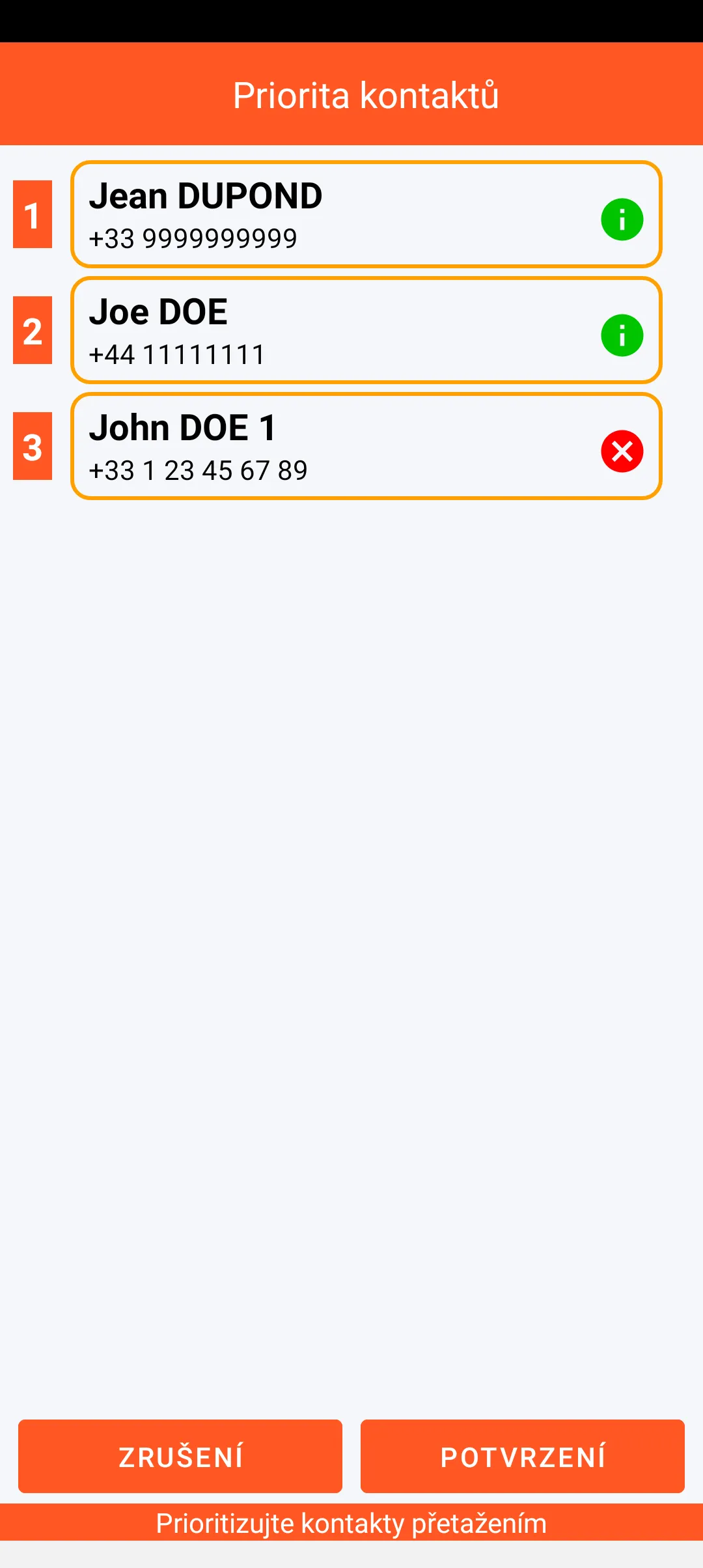 Můžete definovat důvěryhodné osoby, které mají být upozorněny z kontaktů přítomných na smartphonu. Tyto osoby mohou být prioritizovány a informovány, že mohou obdržet zprávu s upozorněním. Každý z kontaktů může být dočasně deaktivován.