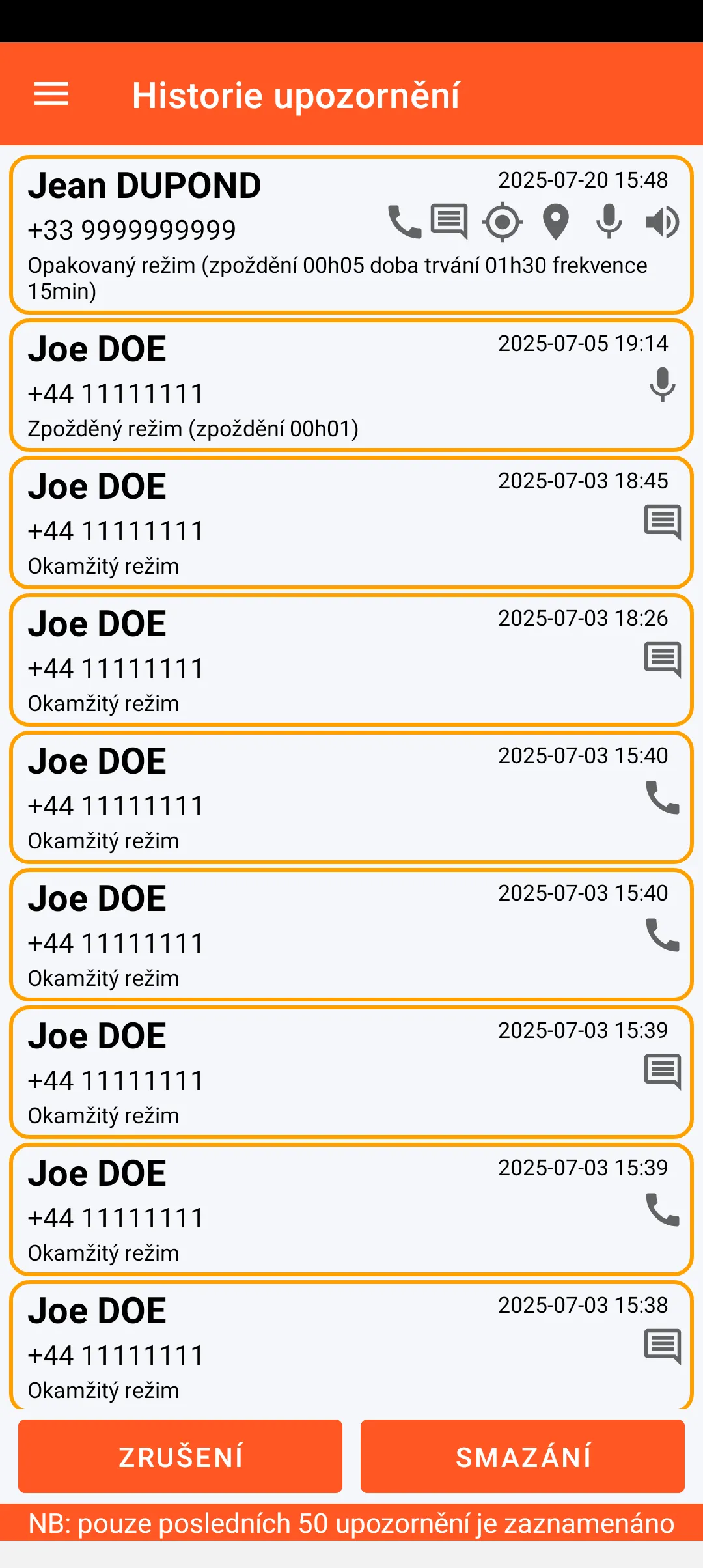 Posledních 50 odeslaných upozornění je zaznamenáno se všemi svými charakteristikami (jméno upozorněného kontaktu, datum a čas, stejně jako obsah a režim upozornění).