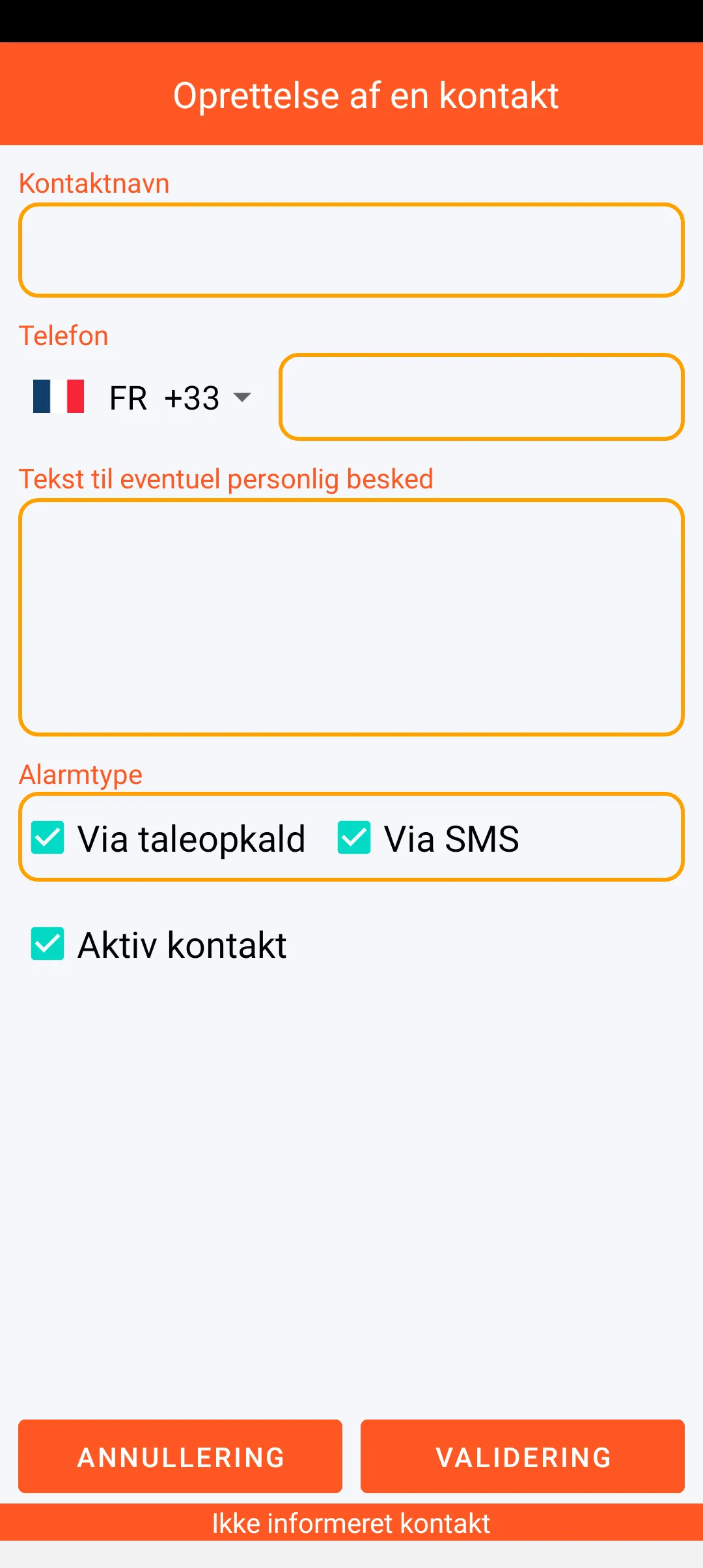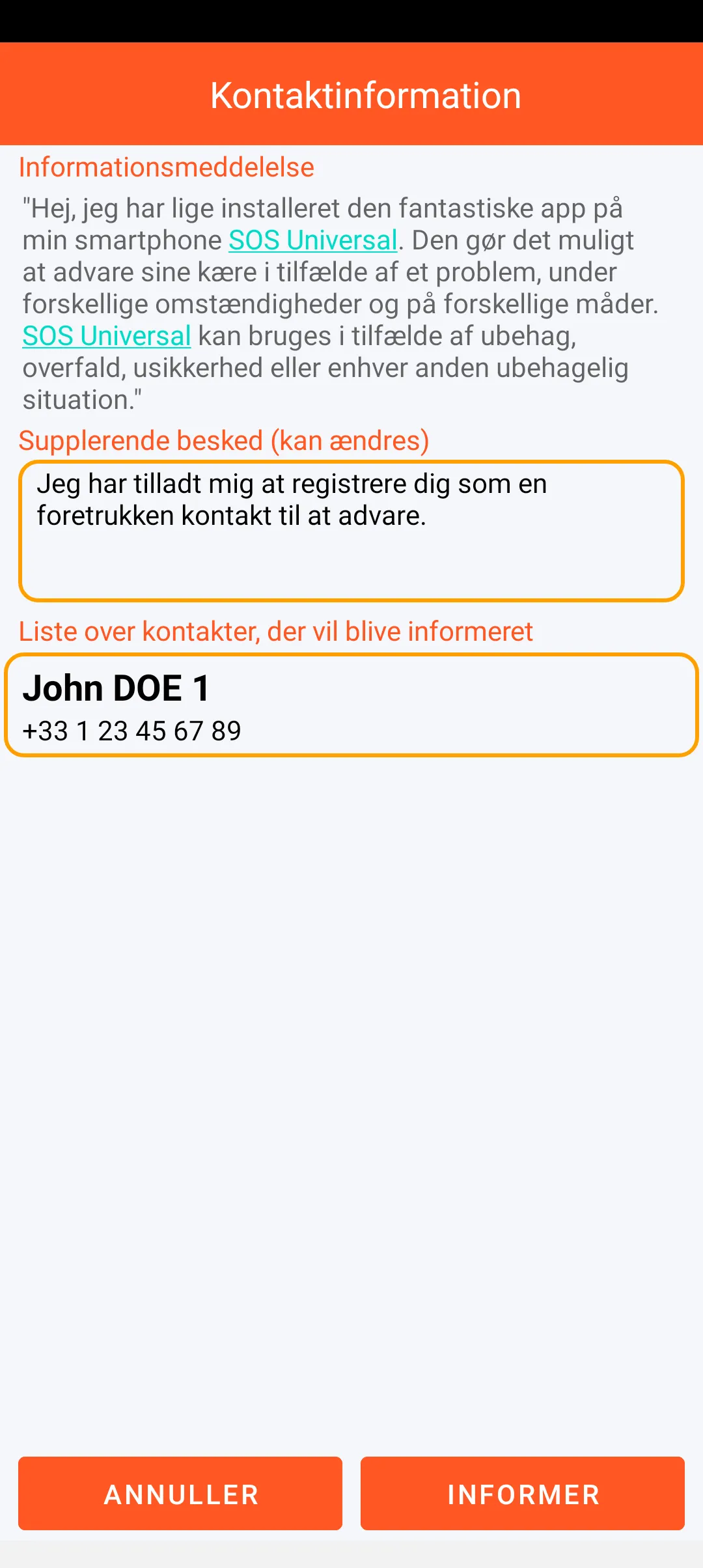 Du kan definere betroede personer, der skal alarmeres, ud fra kontakterne på smartphonen. Disse personer kan prioriteres og informeres om, at de kan modtage en alarmbesked. Hver af kontakterne kan deaktiveres midlertidigt.