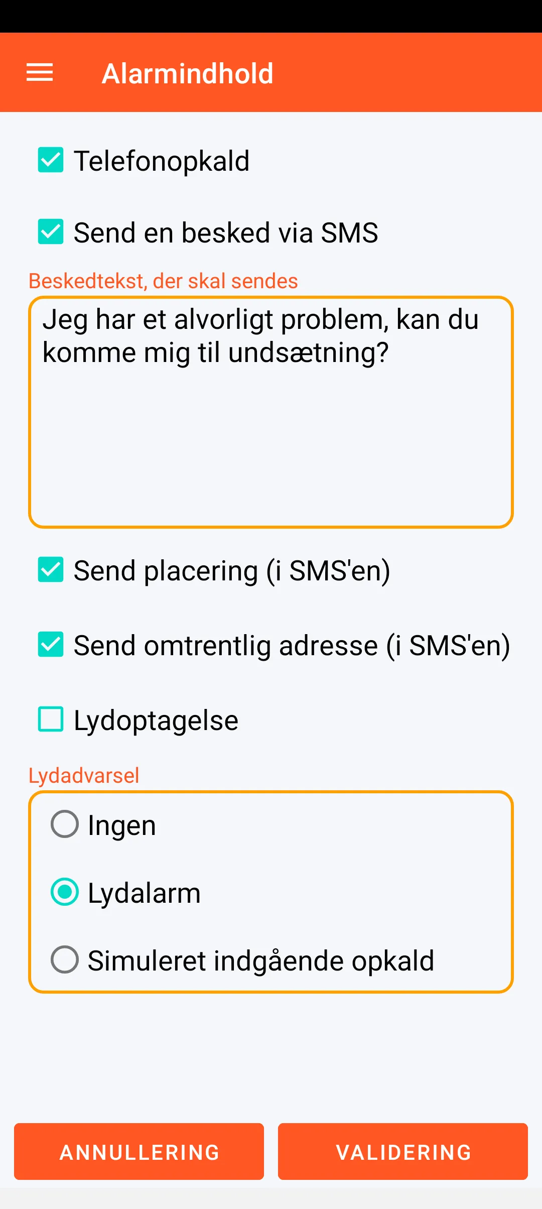 Alarmen kan defineres ved et telefonopkald og en SMS, der kan indeholde (ud over meddelelsesteksten) den geografiske placering (link til et GoogleMaps- eller OpenStreetMap-kort) samt den tilsvarende adresse. Denne alarm kan også udløse en lydoptagelse, en lydalarm eller simulering af et indgående telefonopkald.