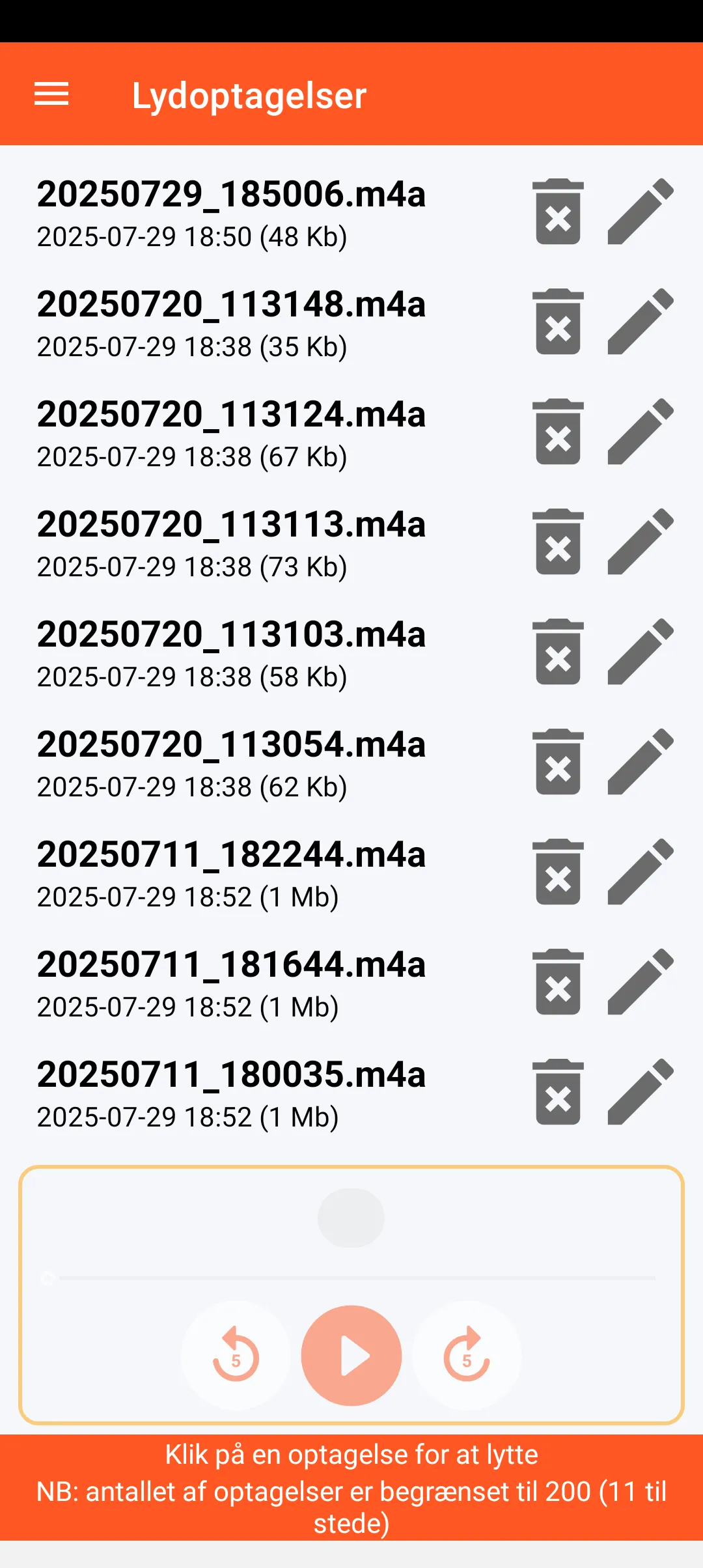 Du kan opbevare op til 200 lydoptagelser, som gemmes i smartphonens downloadmappe. Hver optagelse er tidsstemplet og kan afspilles, omdøbes eller slettes.