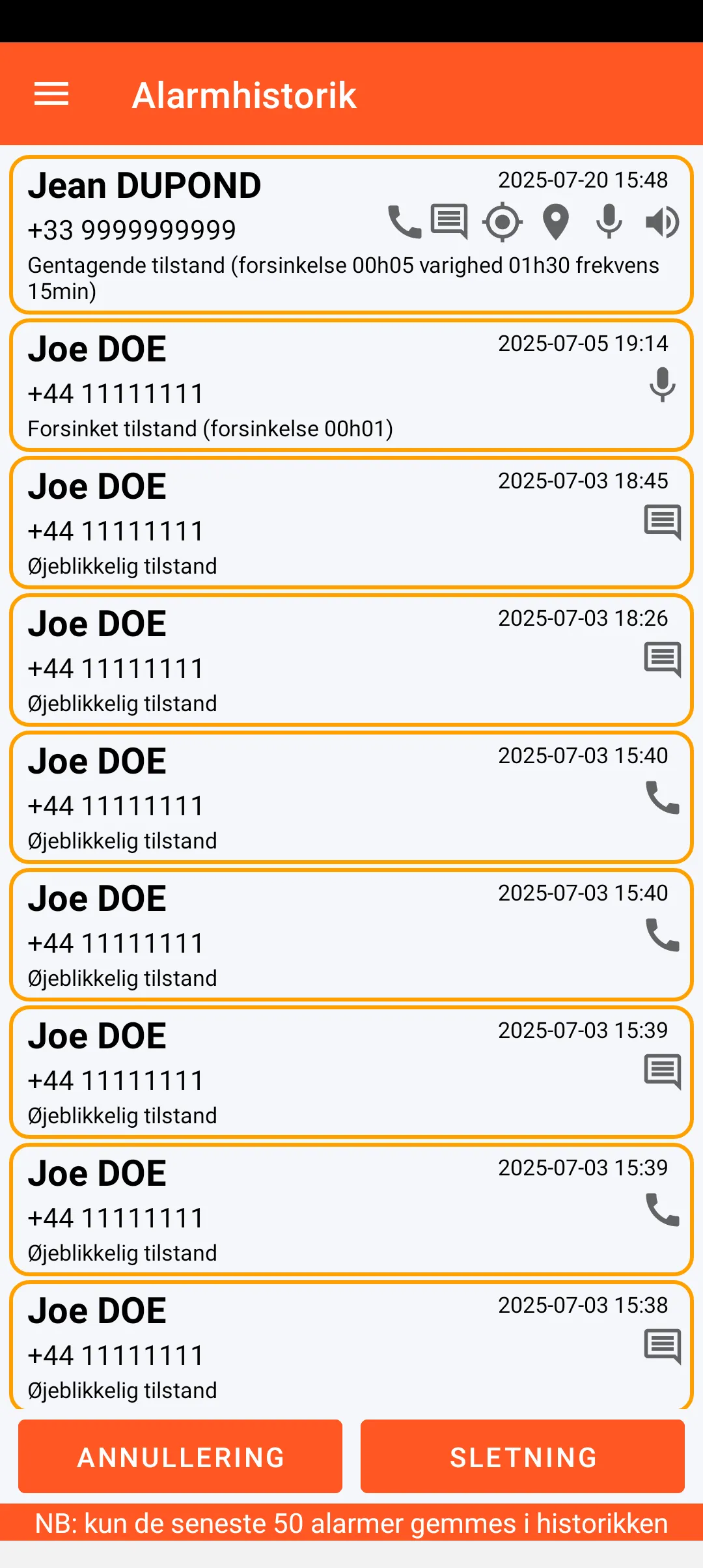 De seneste 50 udsendte alarmer gemmes i historikken med alle deres karakteristika (navn på den alarmerede kontakt, dato og klokkeslæt samt indhold og alarmtilstand).