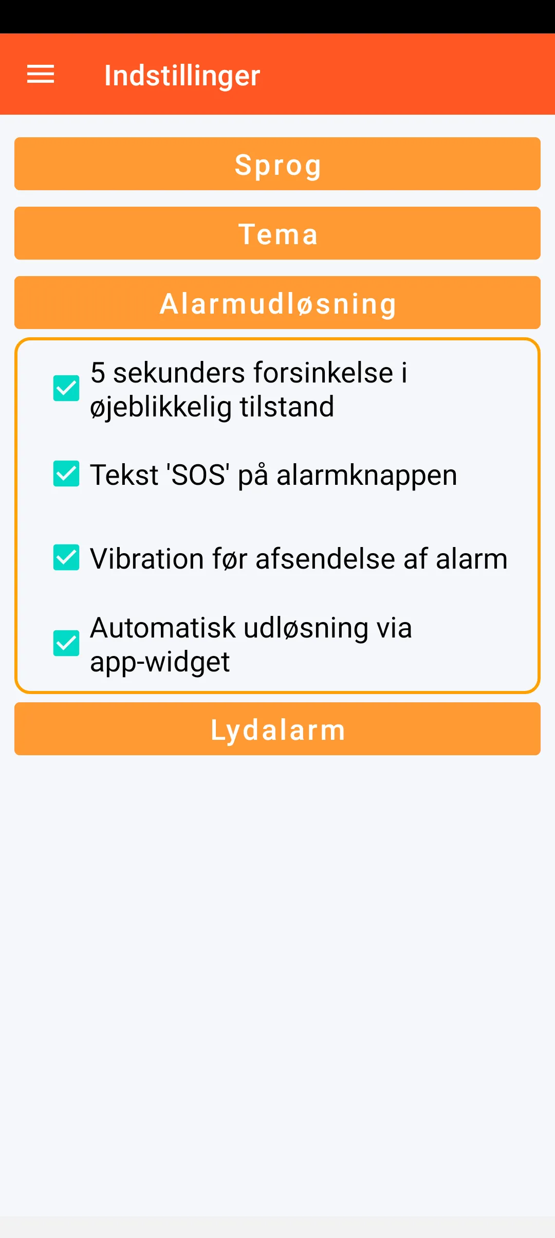 Du kan også foretage forskellige indstillinger vedrørende udløsning af alarmen (5 sekunders forsinkelse i øjeblikkelig tilstand, visning eller ikke visning af tekst på alarmknappen, eventuel vibration før afsendelse af alarmen og automatisk udløsning af denne alarm fra en app-widget, direkte fra smartphonens startskærm).