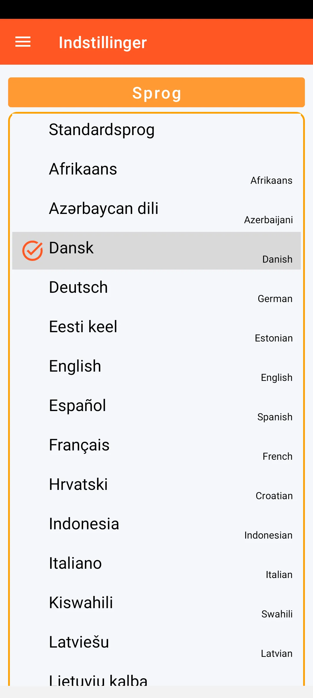 Sproget i SOS Universal (54 sprog er tilgængelige) samt det visuelle tema (lys eller mørk) kan indstilles.