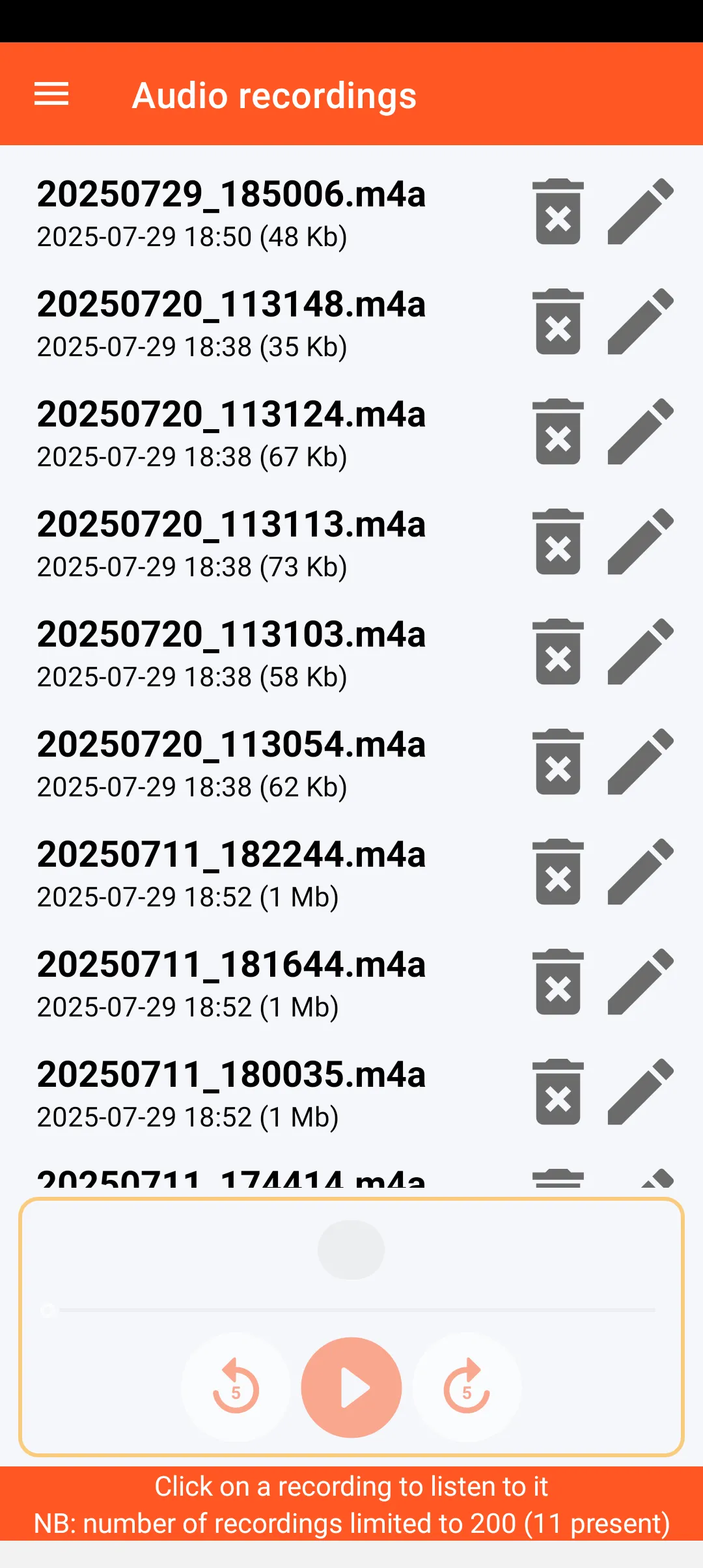 You can keep up to 200 audio recordings which are stored in your smartphone’s download directory. Each recording is timestamped and can be listened to, renamed, or deleted.