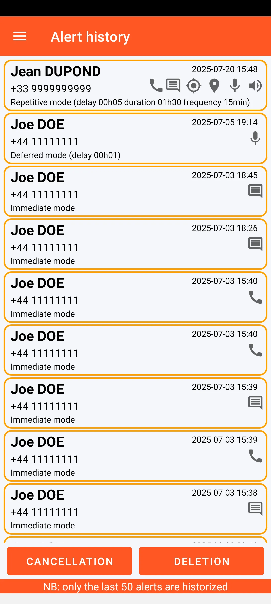 The last 50 alerts sent are historized with all their characteristics (name of the alerted contact, date and time, as well as content and alert mode).