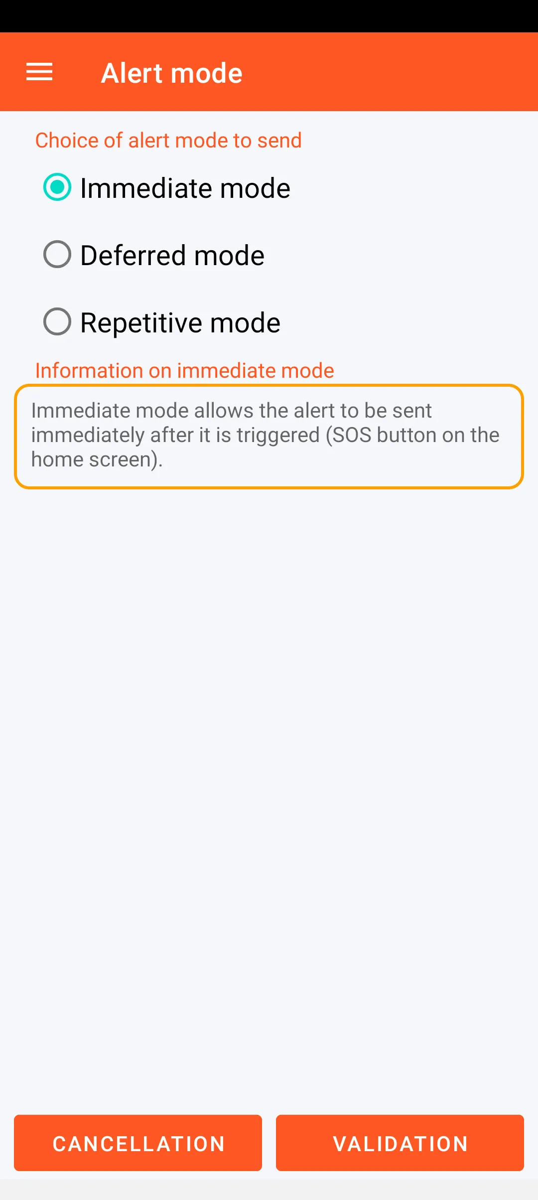 Immediate mode allows the alert to be sent immediately after it is triggered (SOS button on the home screen).