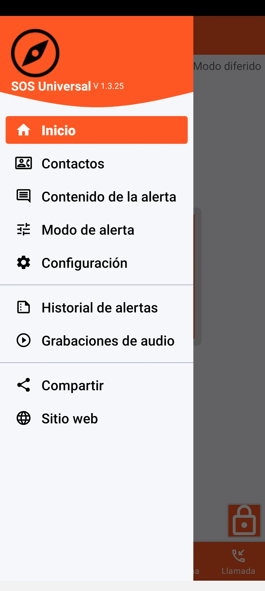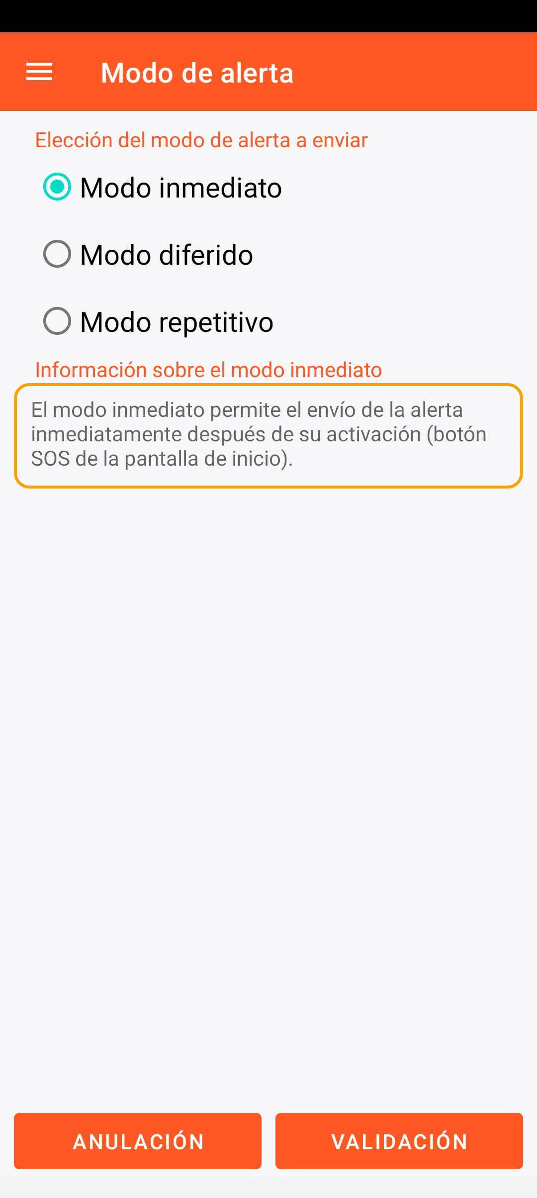 El modo inmediato permite el envío de la alerta inmediatamente después de su activación (botón SOS de la pantalla de inicio).
