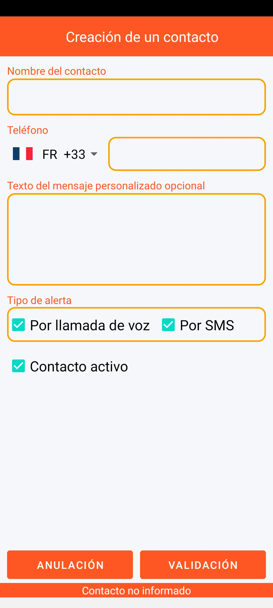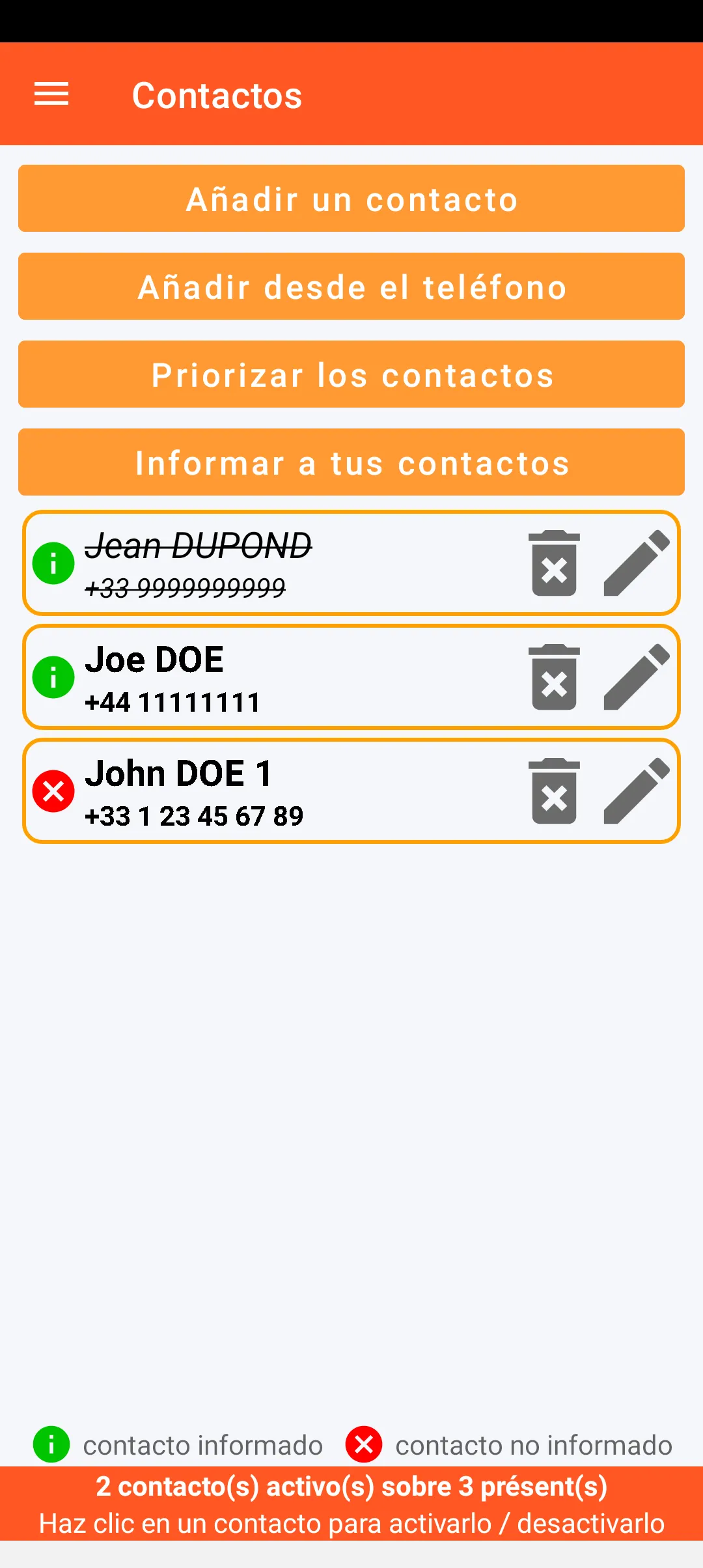 Puede definir las personas de confianza a las que alertar a partir de los contactos presentes en el smartphone. Estas personas pueden ser priorizadas e informadas de que pueden recibir un mensaje de alerta. Cada uno de los contactos puede ser desactivado temporalmente.
