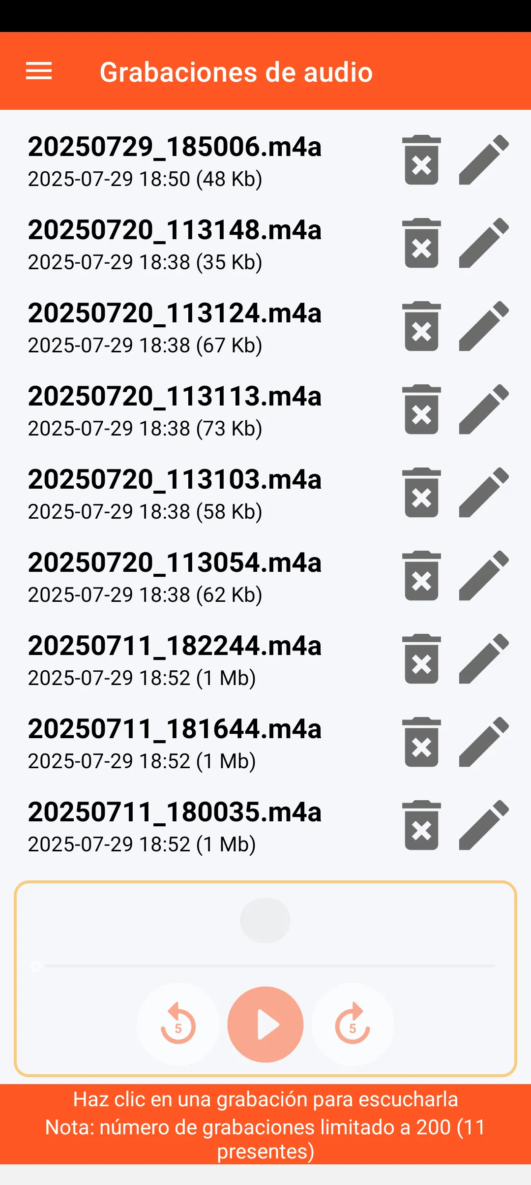 Puede conservar hasta 200 grabaciones de audio que se almacenan en el directorio de descargas de su smartphone. Cada grabación tiene una marca de tiempo y se puede escuchar, renombrar o eliminar.