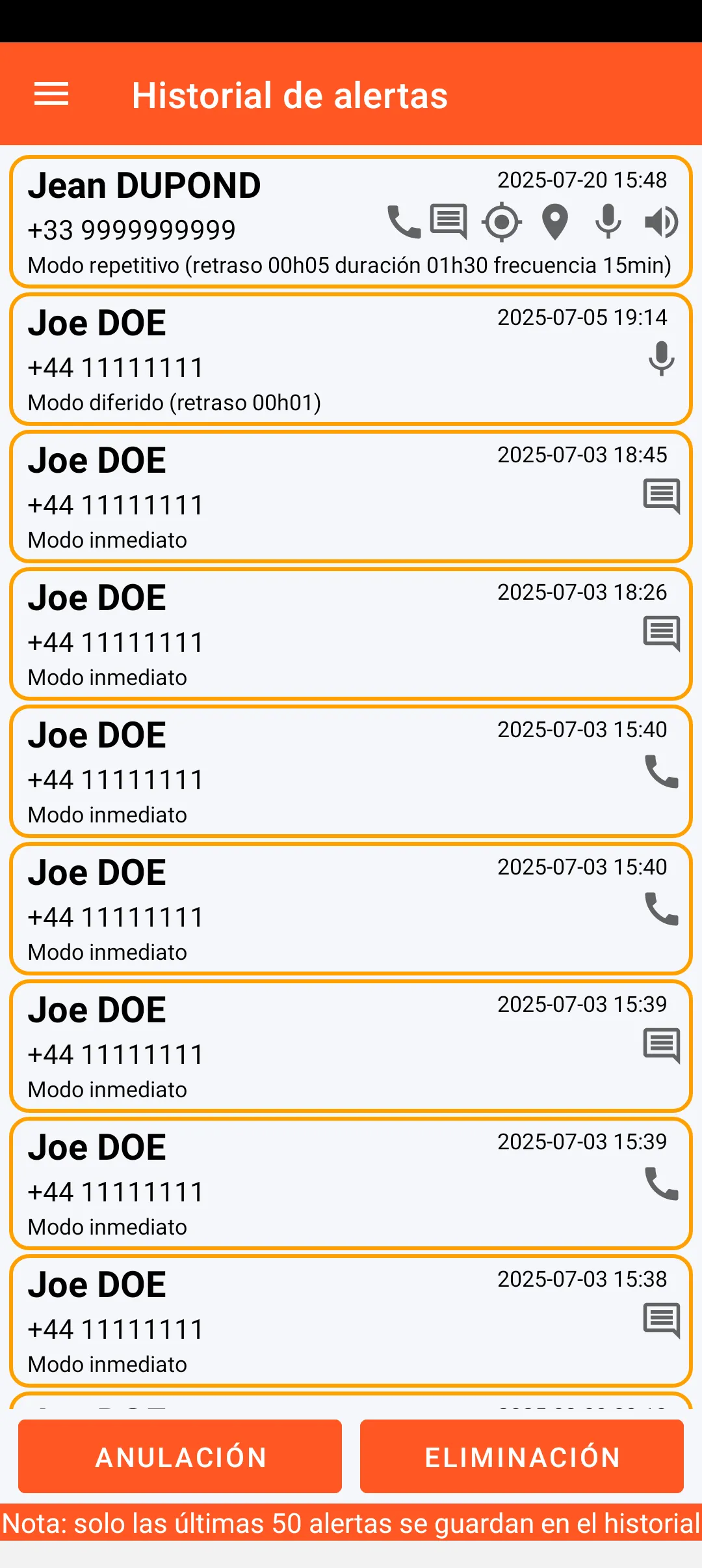 Las últimas 50 alertas emitidas se guardan en el historial con todas sus características (nombre del contacto alertado, fecha y hora, así como el contenido y el modo de alerta).