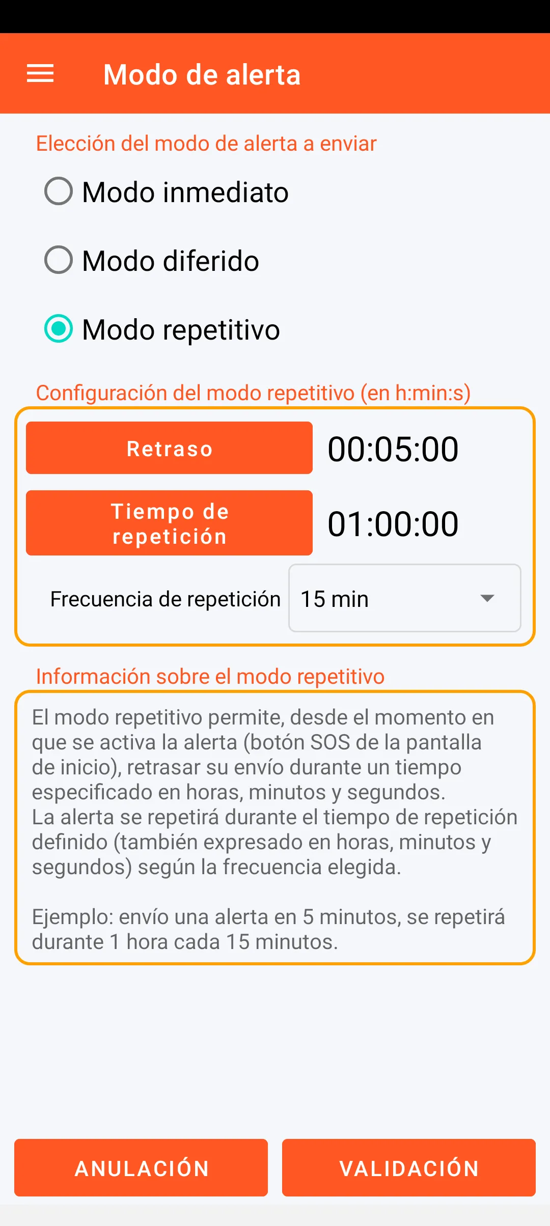 El modo repetitivo permite, desde el momento en que se activa la alerta, también diferir su envío durante un tiempo especificado y repetirla según una frecuencia elegida (ejemplo: envío una alerta en 5 minutos, se repetirá durante 1 hora cada 15 minutos).