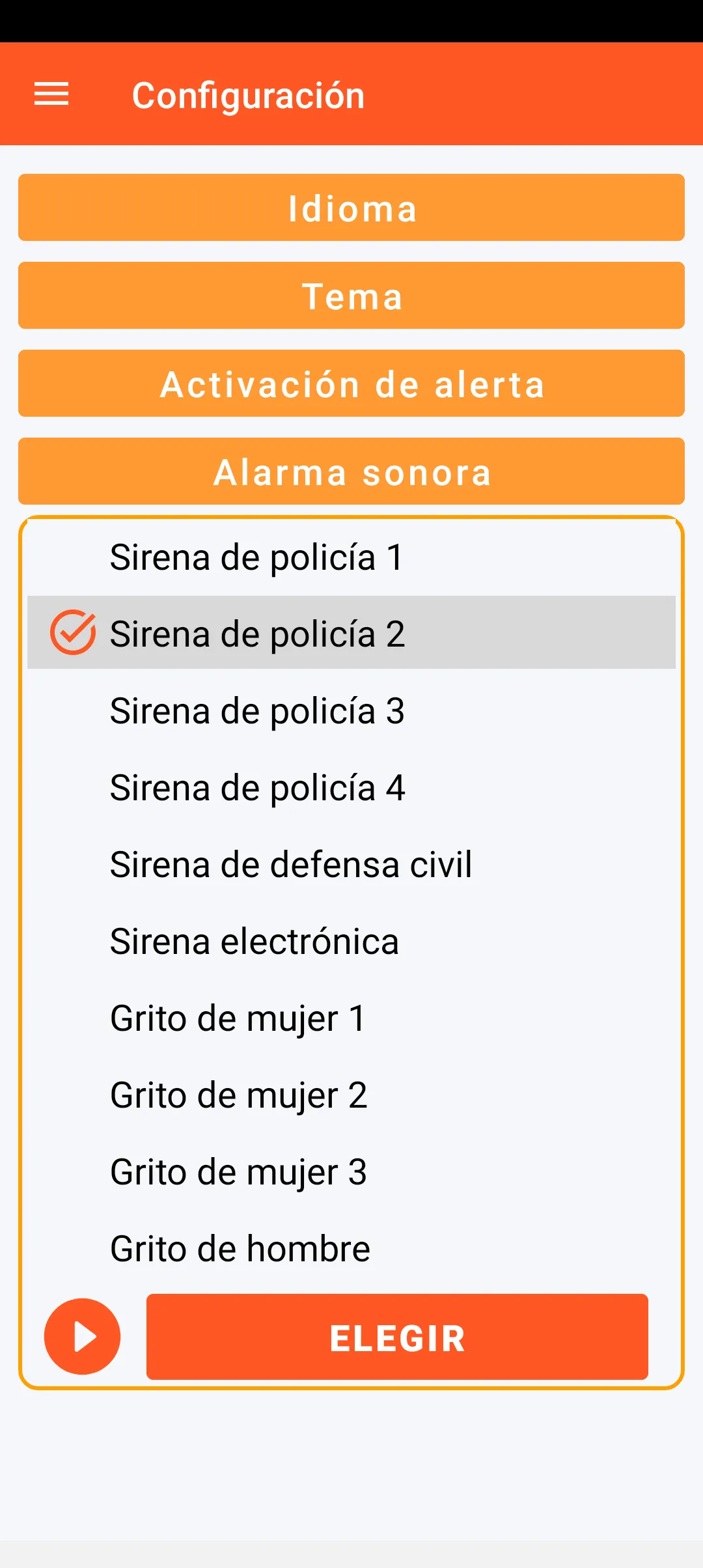 En cuanto a la elección de la alarma sonora, tiene a su disposición 6 grabaciones de sirena y 4 grabaciones de grito humano.