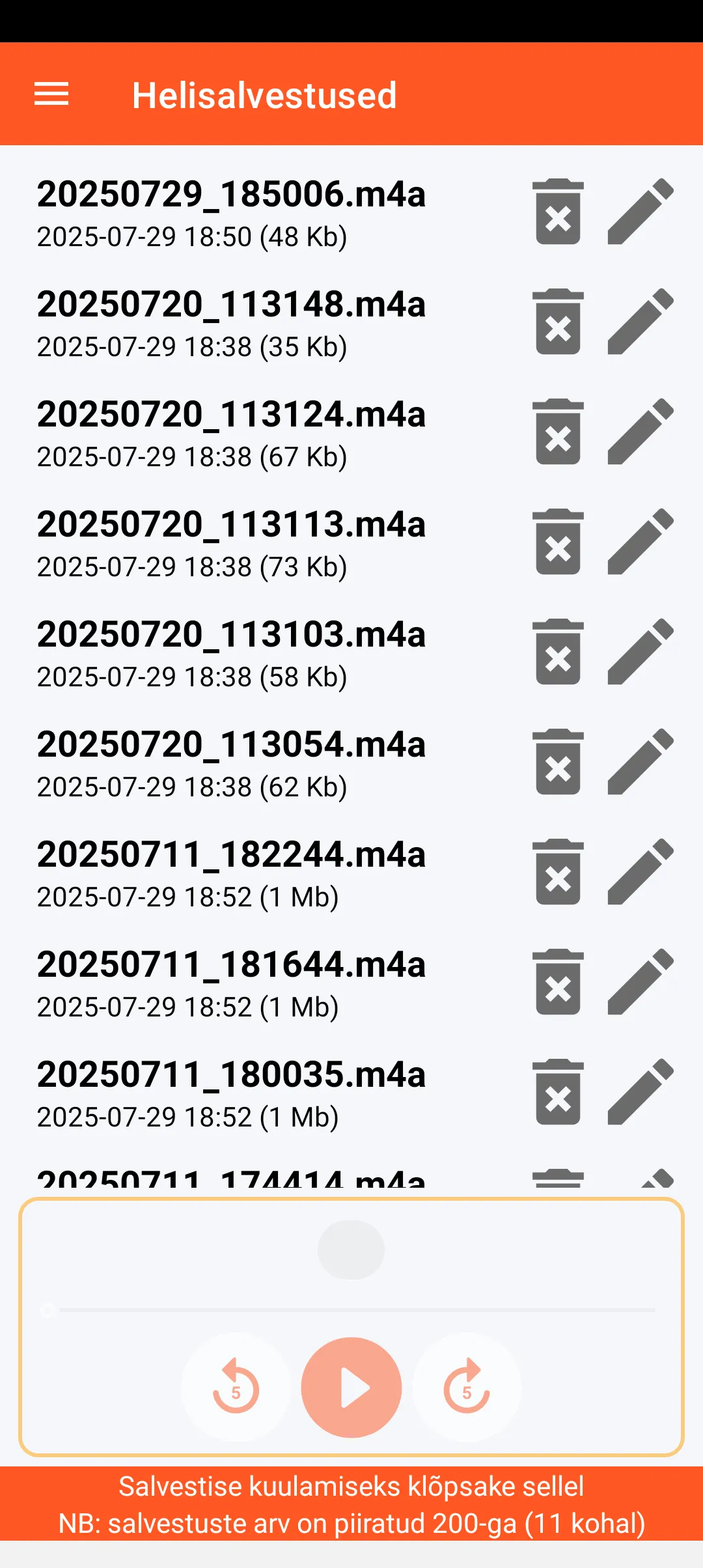 Saate säilitada kuni 200 helisalvestist, mis on salvestatud teie nutitelefoni allalaadimiste kausta. Iga salvestis on ajastatud ja seda saab kuulata, ümber nimetada või kustutada.