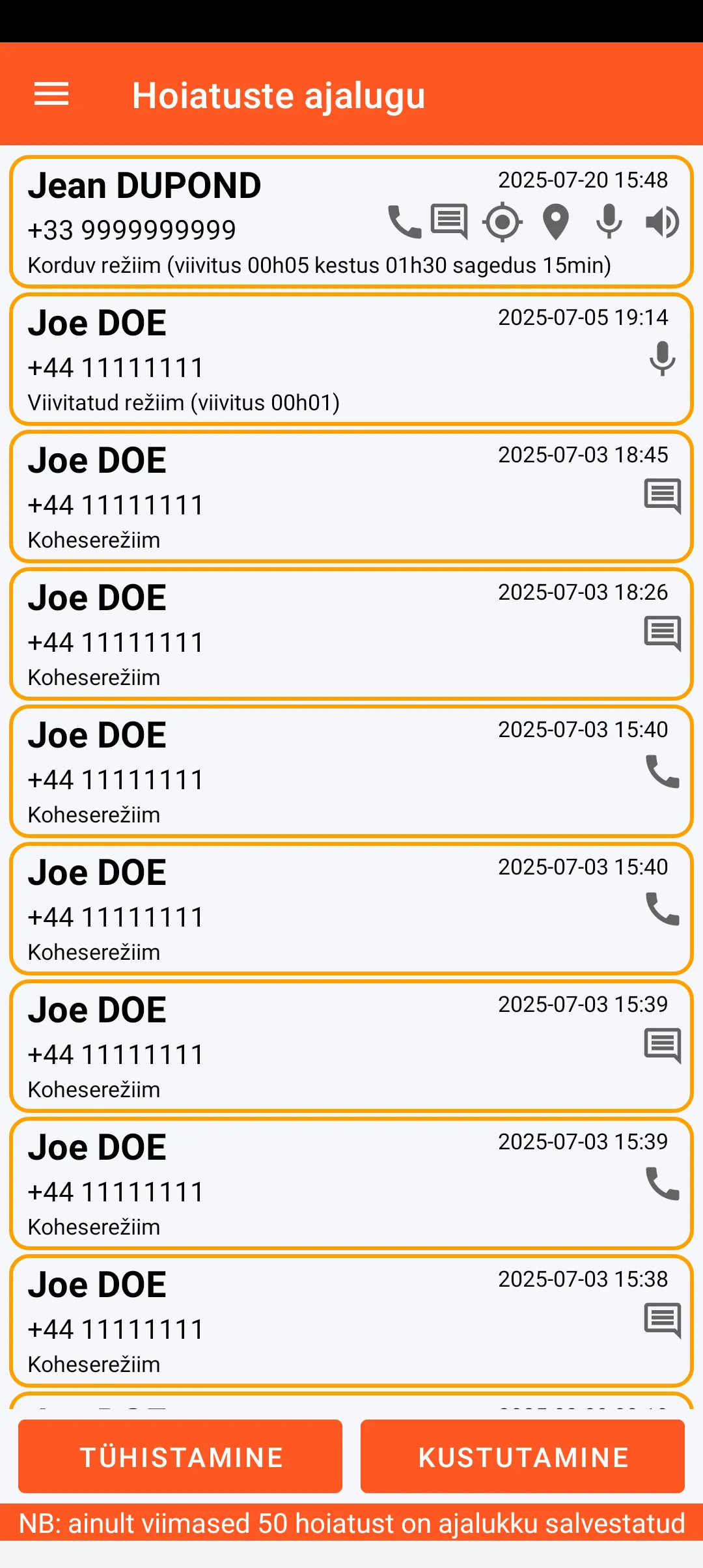 Viimased 50 saadetud hoiatust on ajalukku salvestatud koos kõigi nende omadustega (hoiatatud kontakti nimi, kuupäev ja kellaaeg ning hoiatuse sisu ja režiim).