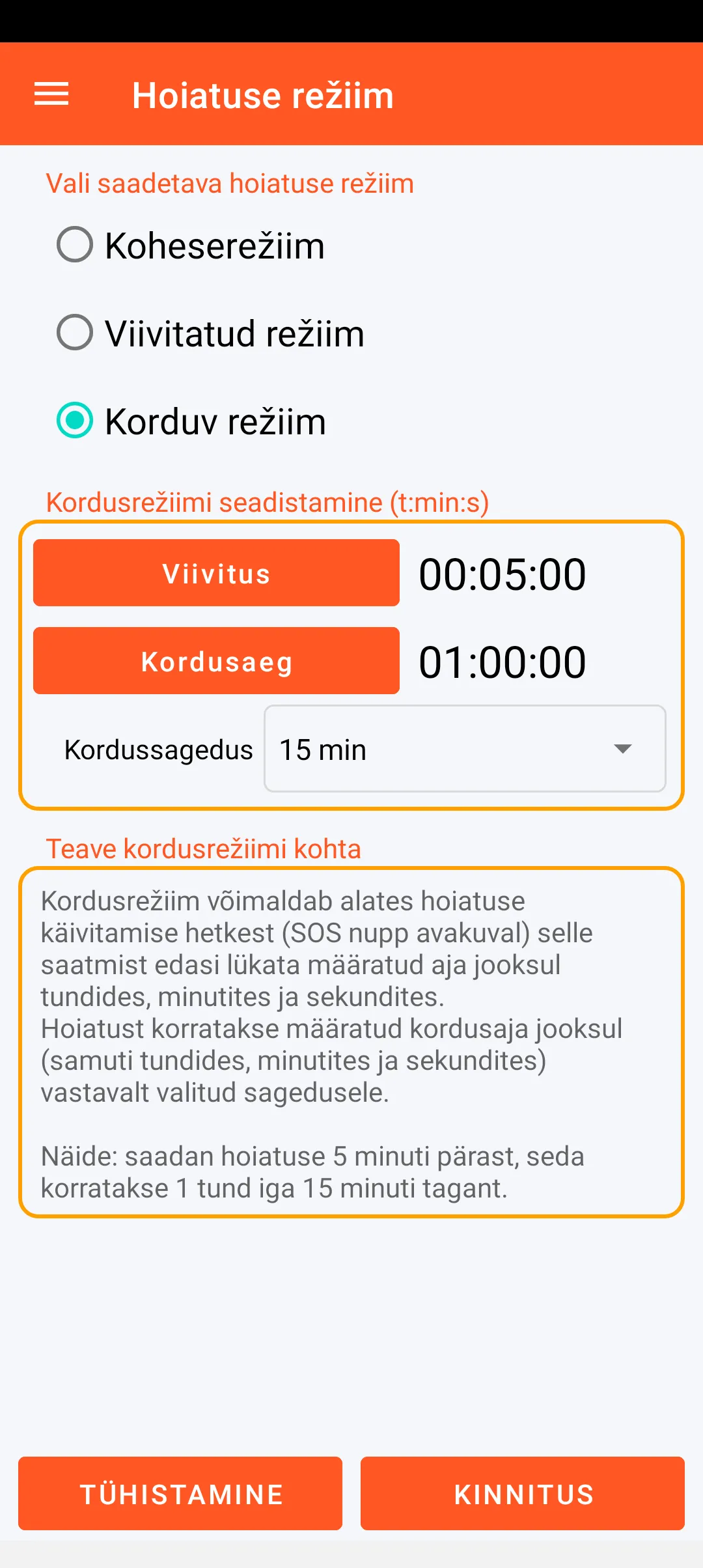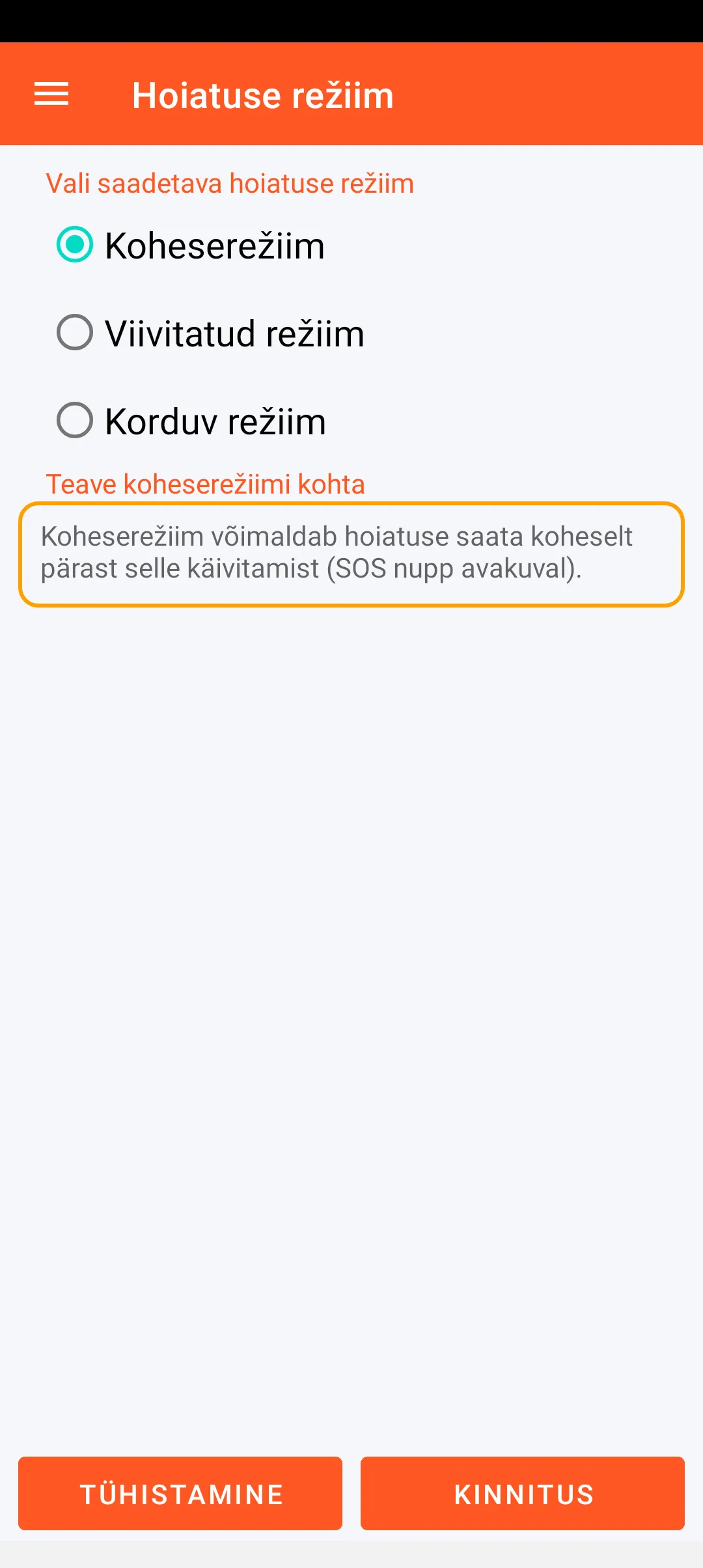 Koheserežiim võimaldab hoiatuse saata koheselt pärast selle käivitamist (SOS nupp avakuval).