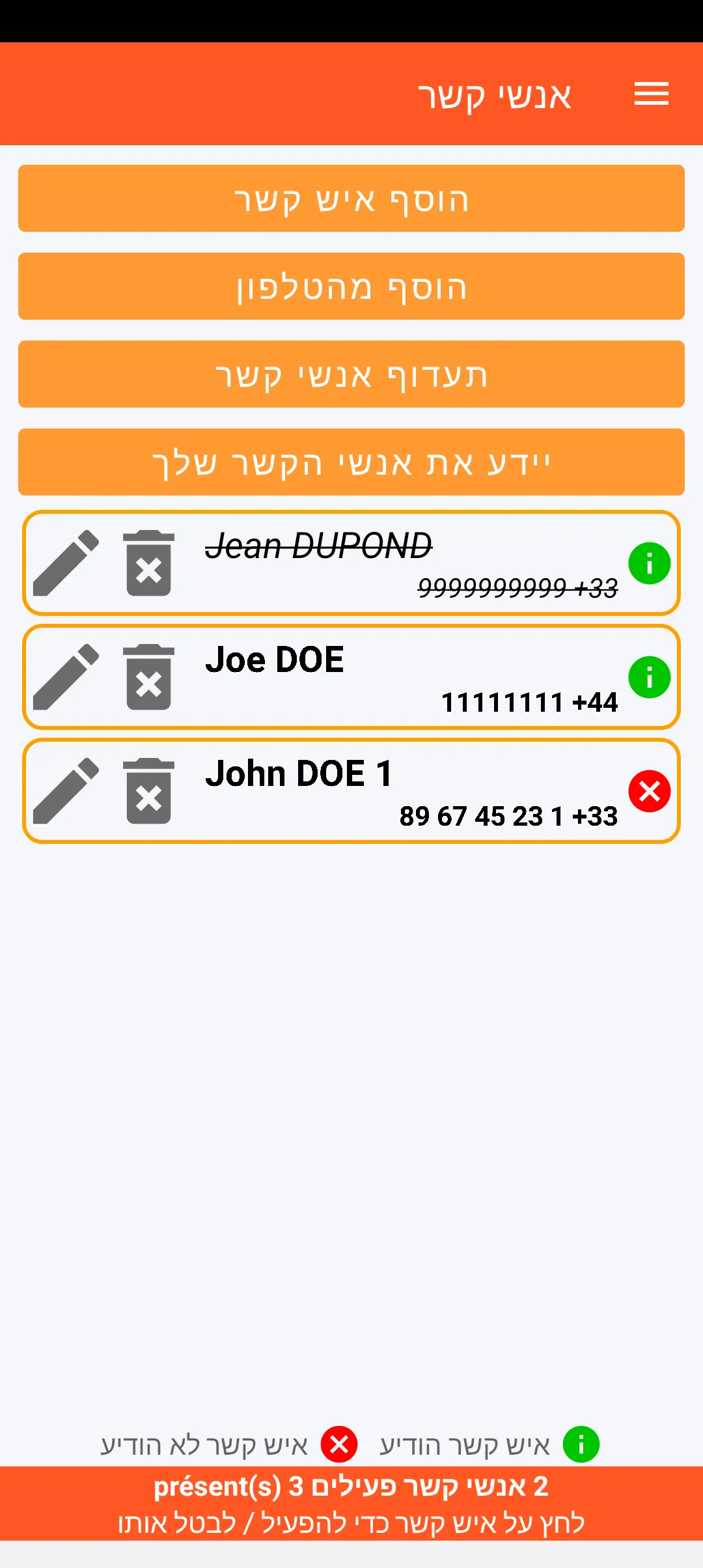 ניתן להגדיר את אנשי הקשר המהימנים שיקבלו התראה מבין אנשי הקשר הקיימים בטלפון החכם. ניתן לתעדף אנשים אלו ולהודיע להם שהם עשויים לקבל הודעת התראה. כל אחד מאנשי הקשר יכול להיות מושבת זמנית.