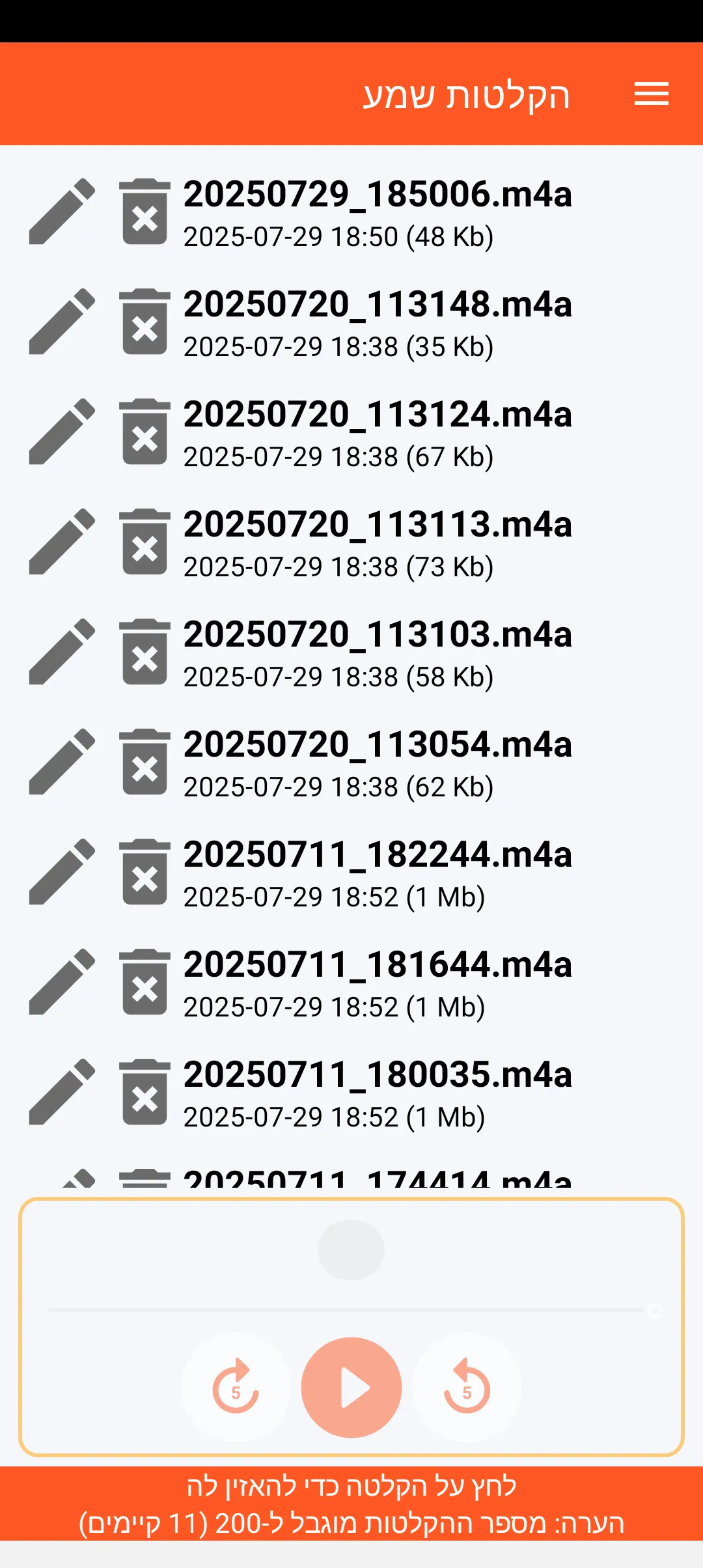 באפשרותך לשמור עד 200 הקלטות שמע המאוחסנות בתיקיית ההורדות של הטלפון החכם שלך. כל הקלטה מתויגת בתאריך ובשעה וניתן להאזין לה, לשנות את שמה או למחוק אותה.