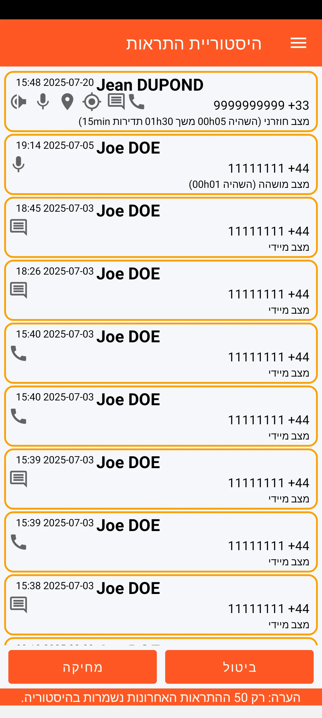 50 ההתראות האחרונות שנשלחו נשמרות בהיסטוריה עם כל מאפייניהן (שם איש הקשר שהוזעק, תאריך ושעה וכן תוכן ואופן ההתראה).