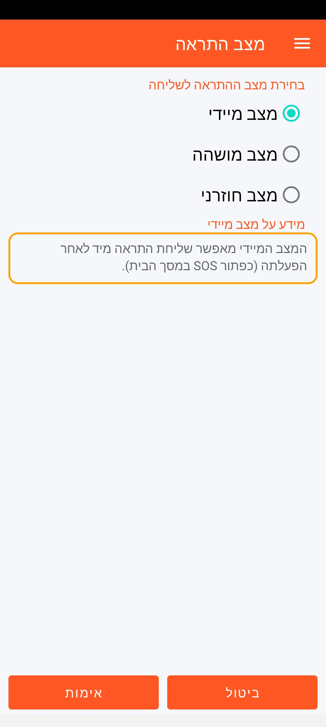 המצב המיידי מאפשר שליחת התראה מיד לאחר הפעלתה (כפתור SOS במסך הבית).