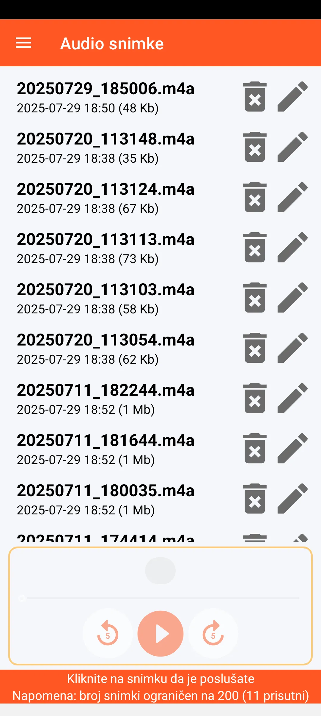 Možete zadržati do 200 audio zapisa koji su pohranjeni u direktoriju za preuzimanja vašeg pametnog telefona. Svaki zapis je označen vremenskom oznakom i može se slušati, preimenovati ili izbrisati.