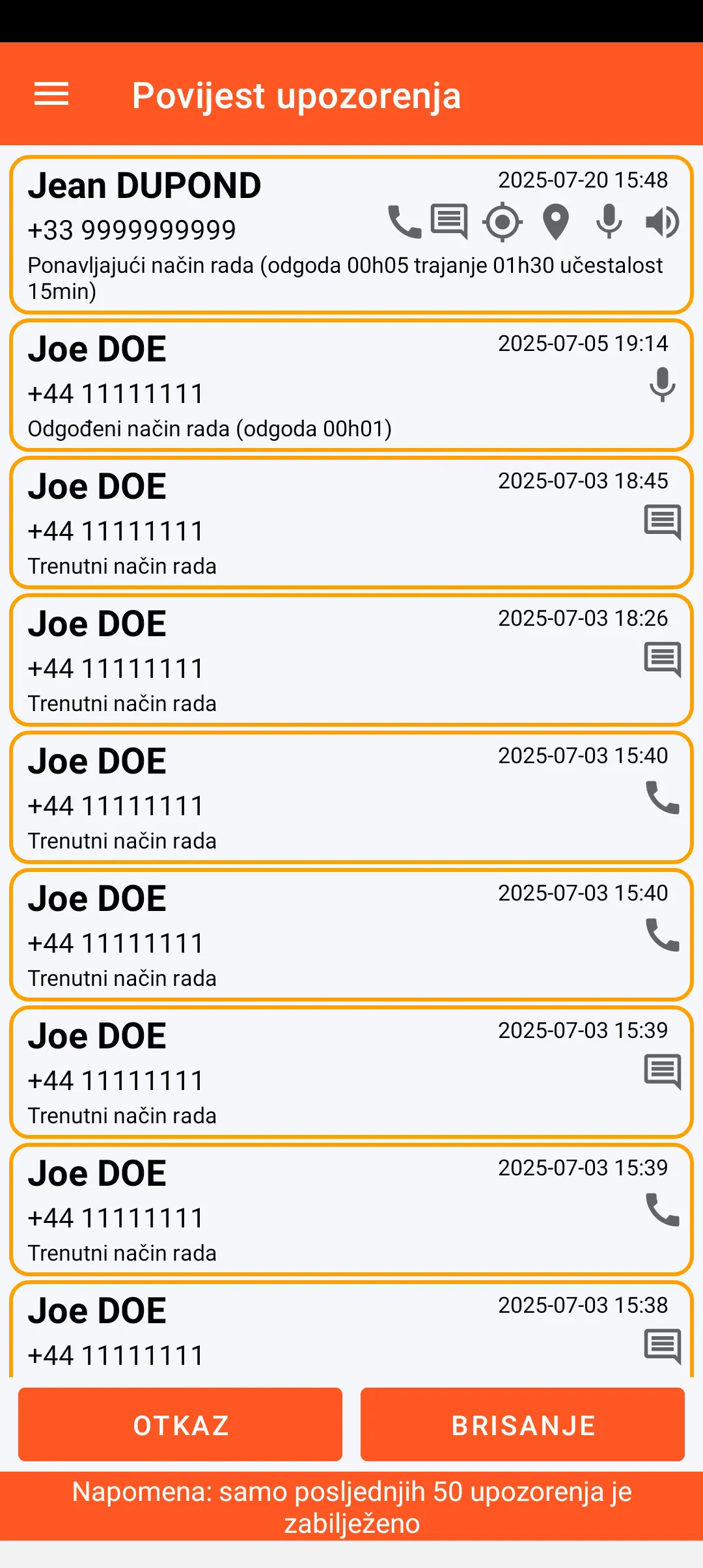 Posljednjih 50 poslanih upozorenja povijesno su zabilježena sa svim svojim karakteristikama (naziv upozorenog kontakta, datum i vrijeme, te sadržaj i način upozorenja).