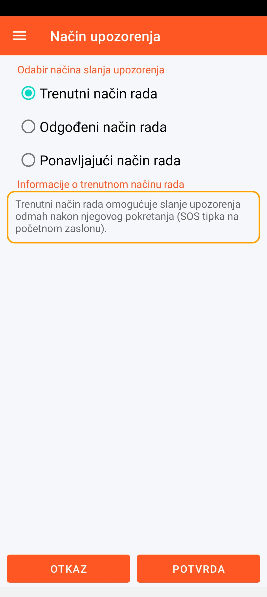 Trenutni način rada omogućuje slanje upozorenja odmah nakon njegovog pokretanja (SOS gumb na početnom zaslonu).