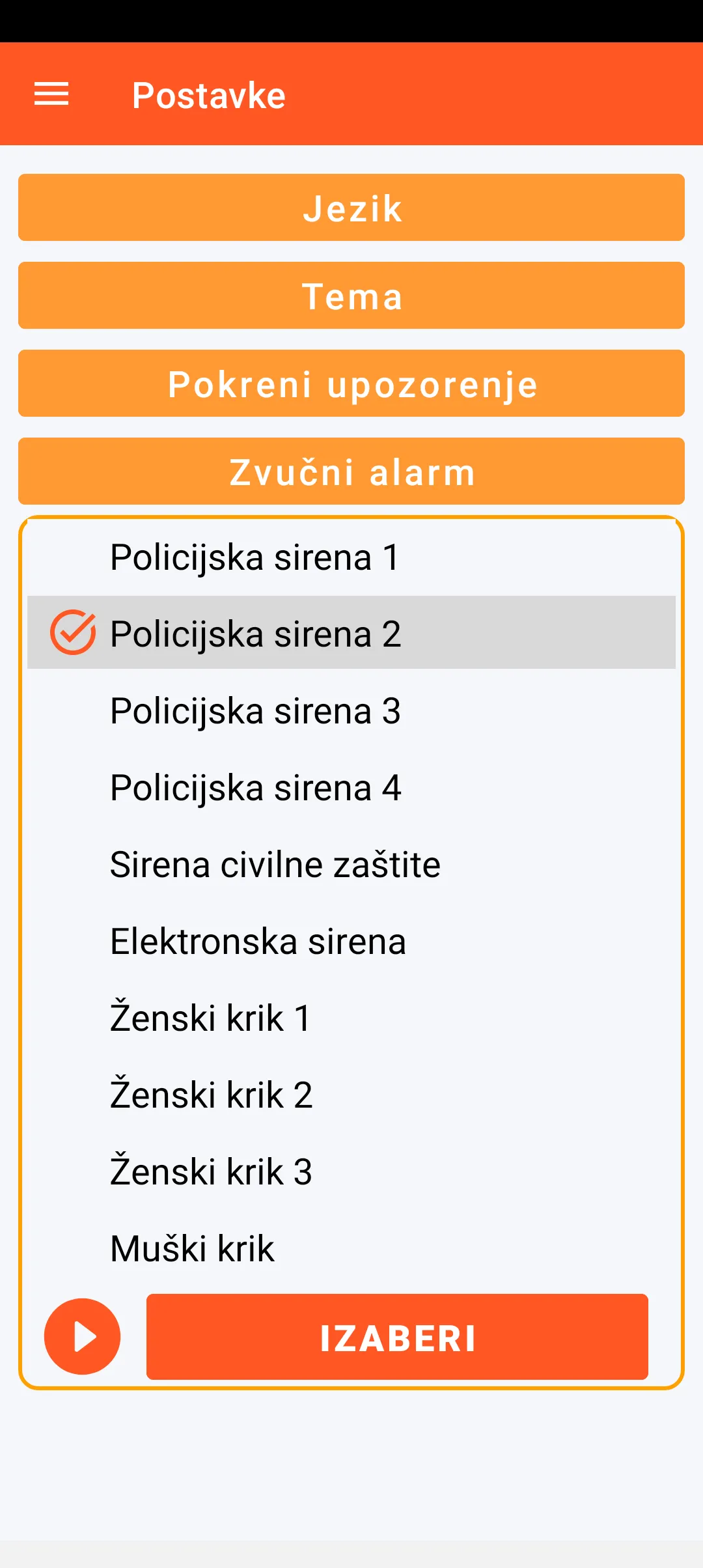 Što se tiče odabira zvučnog alarma, na raspolaganju vam je 6 snimaka sirena i 4 snimke ljudskih krikova.