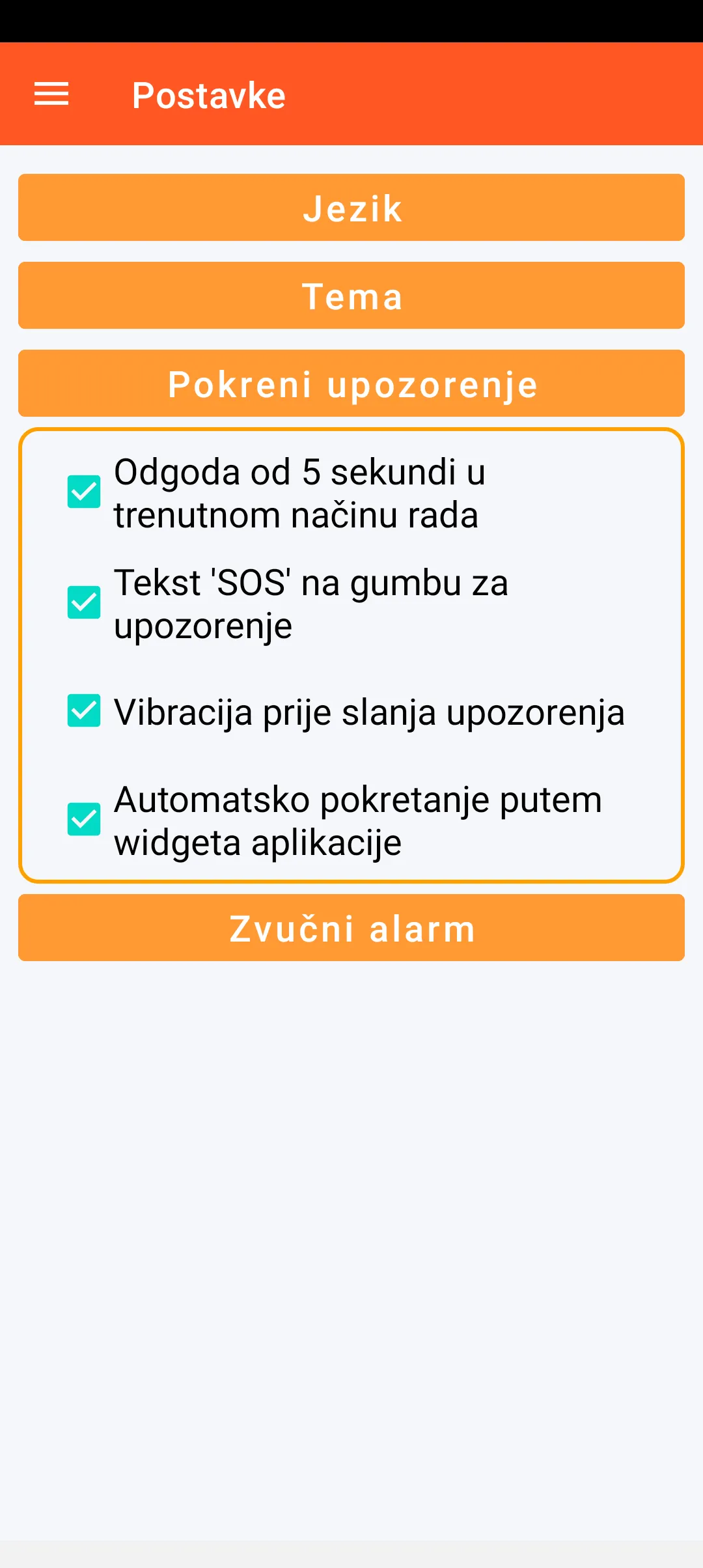 Također možete napraviti različite postavke vezane uz pokretanje upozorenja (odgoda od 5 sekundi u trenutnom načinu rada, prikaz ili skrivanje teksta na gumbu za upozorenje, moguće emitiranje vibracije prije slanja upozorenja i automatsko pokretanje tog upozorenja putem widgeta aplikacije, izravno s početnog zaslona vašeg pametnog telefona).