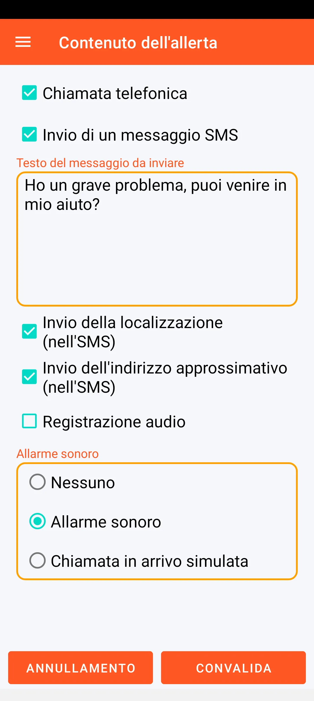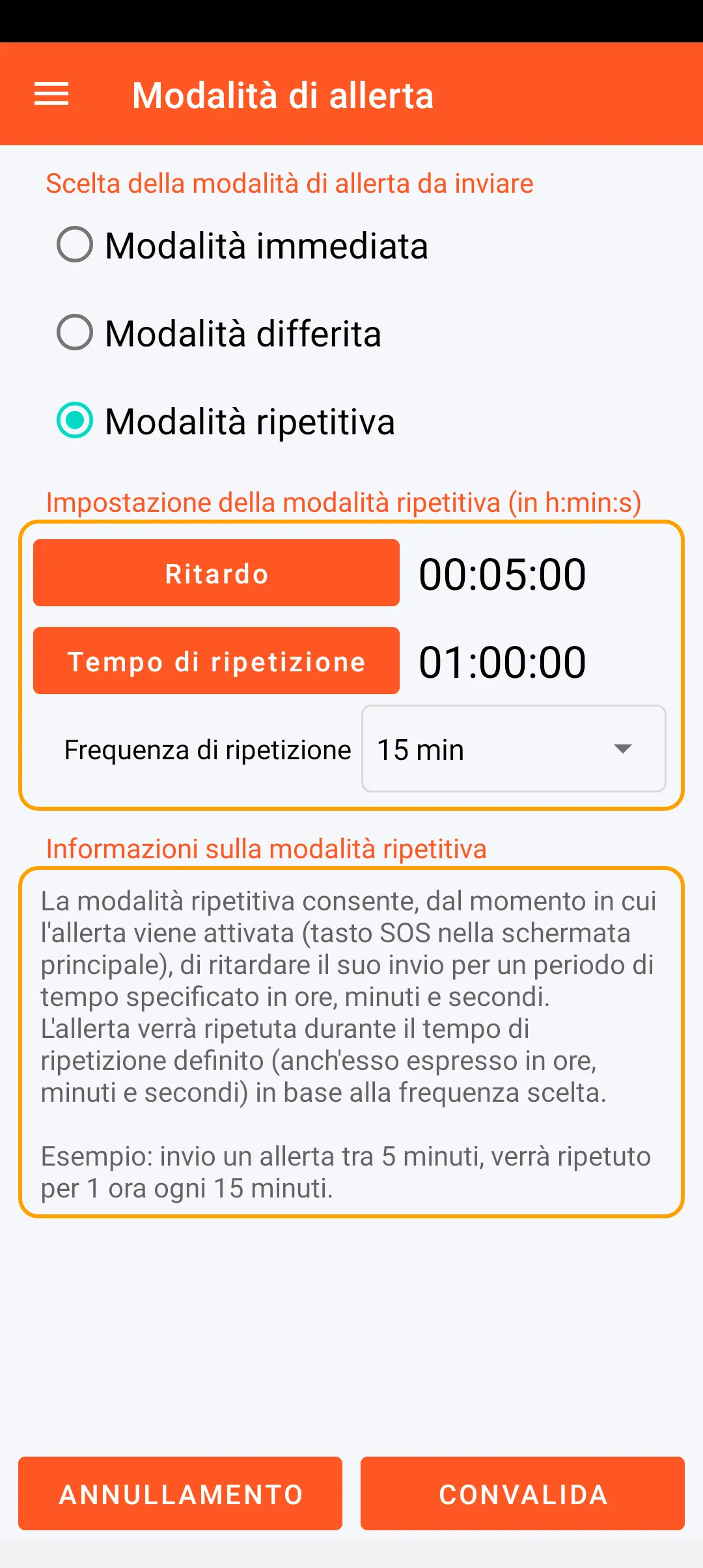 La modalità immediata consente l’invio dell’allerta immediatamente dopo la sua attivazione (tasto SOS della schermata principale).