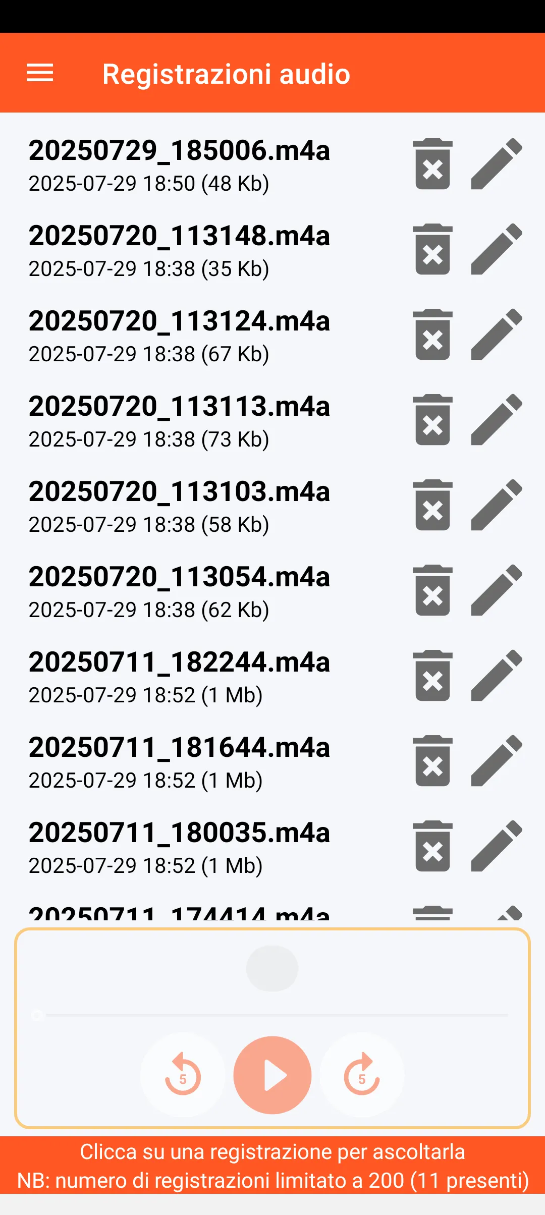 Puoi conservare fino a 200 registrazioni audio che vengono memorizzate nella directory dei download del tuo smartphone. Ogni registrazione è datata e può essere ascoltata, rinominata o cancellata.