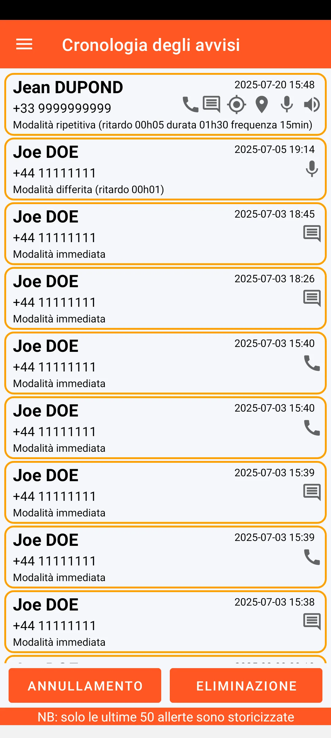 Le ultime 50 allerte emesse sono storicizzate con tutte le loro caratteristiche (nome del contatto allertato, data e ora, contenuto e modalità dell’allerta).