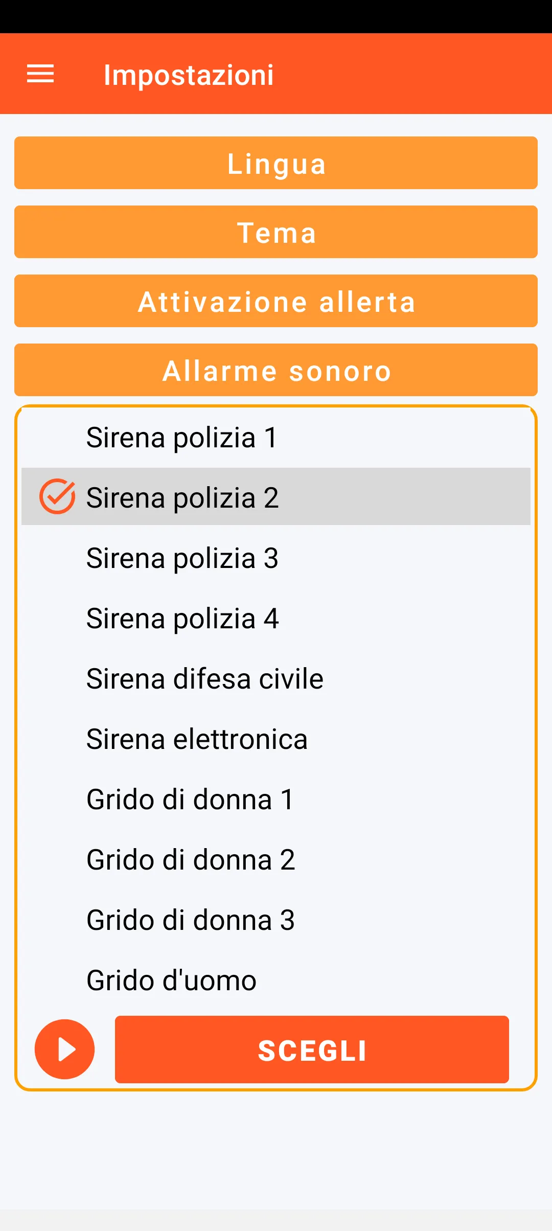 Per quanto riguarda la scelta dell’allarme sonoro, hai a disposizione 6 registrazioni di sirene e 4 registrazioni di urla umane.