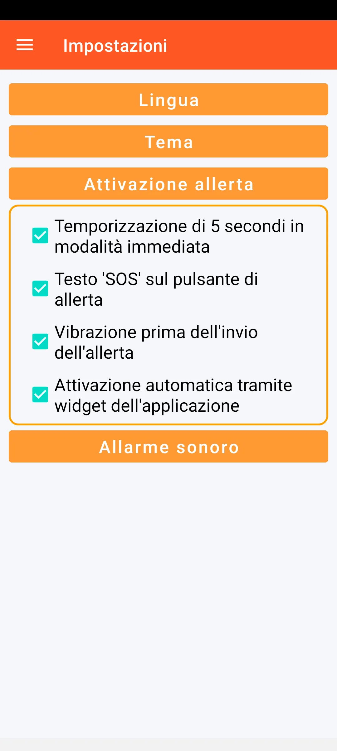 È inoltre possibile effettuare diverse regolazioni relative all’attivazione dell’allerta (temporizzazione di 5 secondi in modalità immediata, visualizzazione o meno del testo sul pulsante di allerta, eventuale emissione di una vibrazione prima dell’invio dell’allerta e attivazione automatica di questa allerta da un widget dell’applicazione, direttamente dalla schermata iniziale dello smartphone).