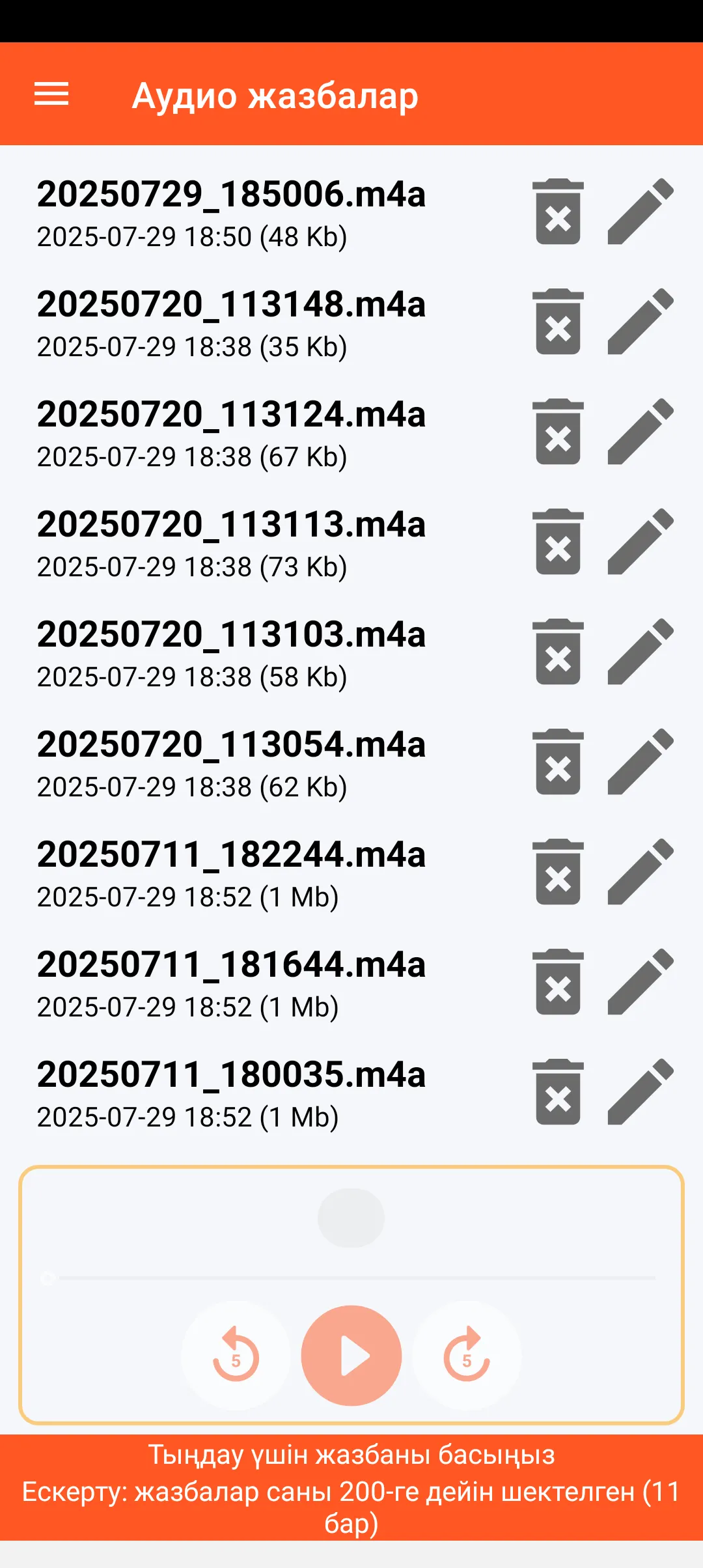 Смартфоныңыздың жүктеу каталогында сақталатын 200-ге дейін аудио жазбаны сақтауға болады. Әрбір жазба уақытымен белгіленген және оны тыңдауға, атын өзгертуге немесе жоюға болады.