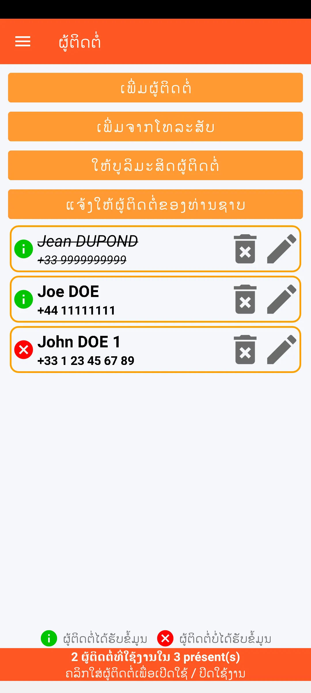 ທ່ານສາມາດກຳນົດບຸກຄົນທີ່ເຊື່ອຖືໄດ້ທີ່ຈະແຈ້ງເຕືອນຈາກລາຍຊື່ຜູ້ຕິດຕໍ່ທີ່ມີຢູ່ໃນສະມາດໂຟນ. ບຸກຄົນເຫຼົ່ານີ້ສາມາດຖືກຈັດລຳດັບຄວາມສຳຄັນ ແລະ ແຈ້ງໃຫ້ຊາບວ່າພວກເຂົາຈະສາມາດໄດ້ຮັບຂໍ້ຄວາມແຈ້ງເຕືອນ. ແຕ່ລະຜູ້ຕິດຕໍ່ສາມາດຖືກປິດໃຊ້ງານຊົ່ວຄາວໄດ້.