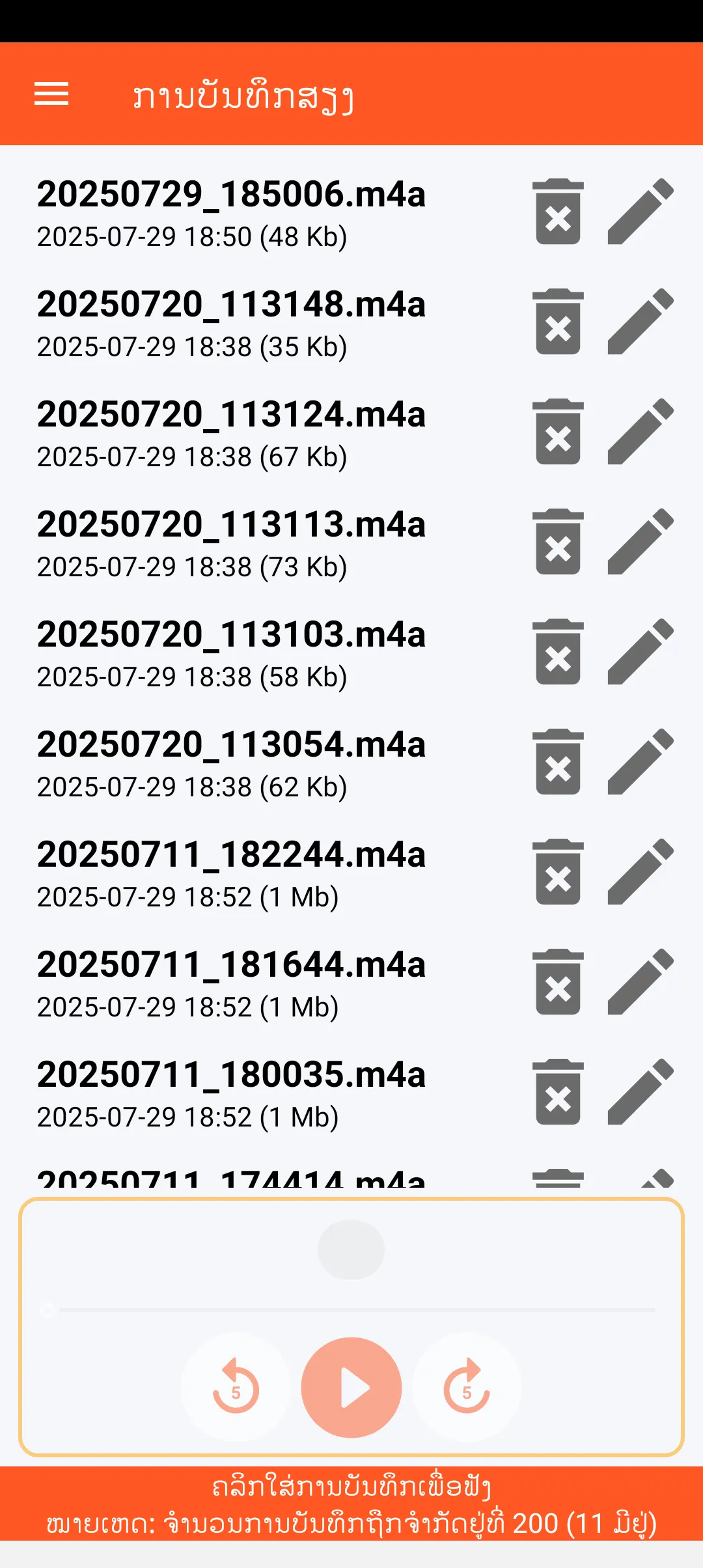 ທ່ານສາມາດເກັບຮັກສາການບັນທຶກສຽງໄດ້ເຖິງ 200 ລາຍການເຊິ່ງຖືກເກັບໄວ້ໃນໂຟເດີດາວໂຫຼດຂອງສະມາດໂຟນຂອງທ່ານ. ແຕ່ລະການບັນທຶກຈະມີເວລາ ແລະ ວັນທີ, ແລະ ສາມາດຟັງ, ປ່ຽນຊື່ ຫຼື ລຶບໄດ້.
