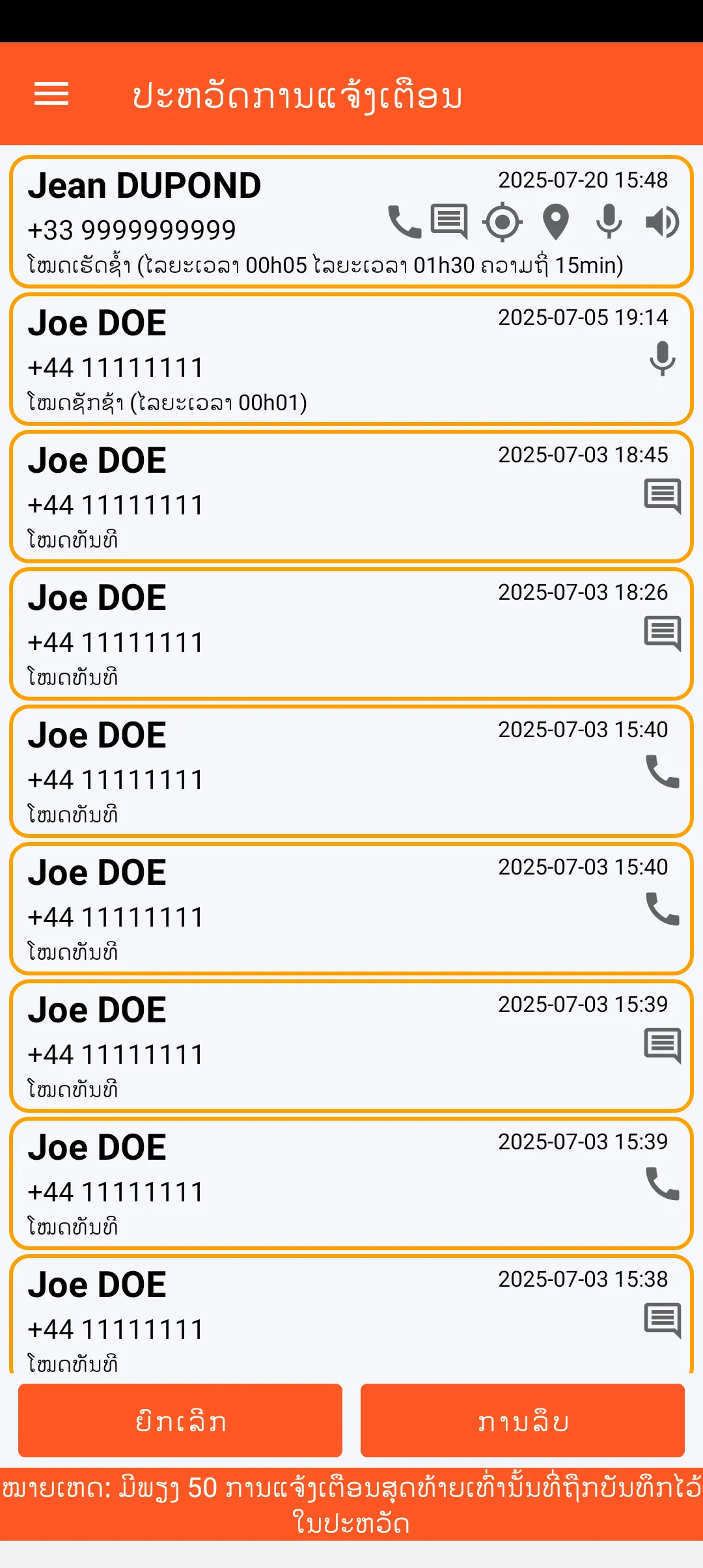 50 ການແຈ້ງເຕືອນສຸດທ້າຍທີ່ຖືກສົ່ງຖືກເກັບໄວ້ໃນປະຫວັດພ້ອມດ້ວຍຄຸນລັກສະນະທັງໝົດຂອງພວກມັນ (ຊື່ຜູ້ຕິດຕໍ່ທີ່ໄດ້ຮັບການແຈ້ງເຕືອນ, ວັນທີ ແລະ ເວລາ ພ້ອມທັງເນື້ອໃນ ແລະ ໂໝດການແຈ້ງເຕືອນ).