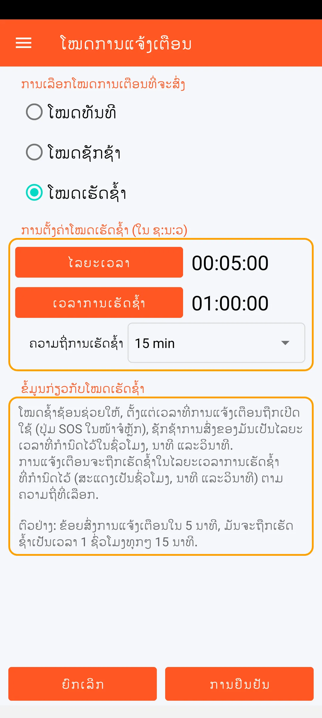 ໂໝດຊ້ຳຍັງຊ່ວຍໃຫ້, ຕັ້ງແຕ່ເວລາທີ່ການແຈ້ງເຕືອນຖືກເປີດໃຊ້, ຊັກຊ້າການສົ່ງຂອງມັນເປັນໄລຍະເວລາທີ່ກຳນົດ ແລະ ເຮັດຊ້ຳຕາມຄວາມຖີ່ທີ່ເລືອກ (ຕົວຢ່າງ: ຂ້ອຍສົ່ງການແຈ້ງເຕືອນໃນ 5 ນາທີ, ມັນຈະຖືກເຮັດຊ້ຳເປັນເວລາ 1 ຊົ່ວໂມງທຸກໆ 15 ນາທີ).
