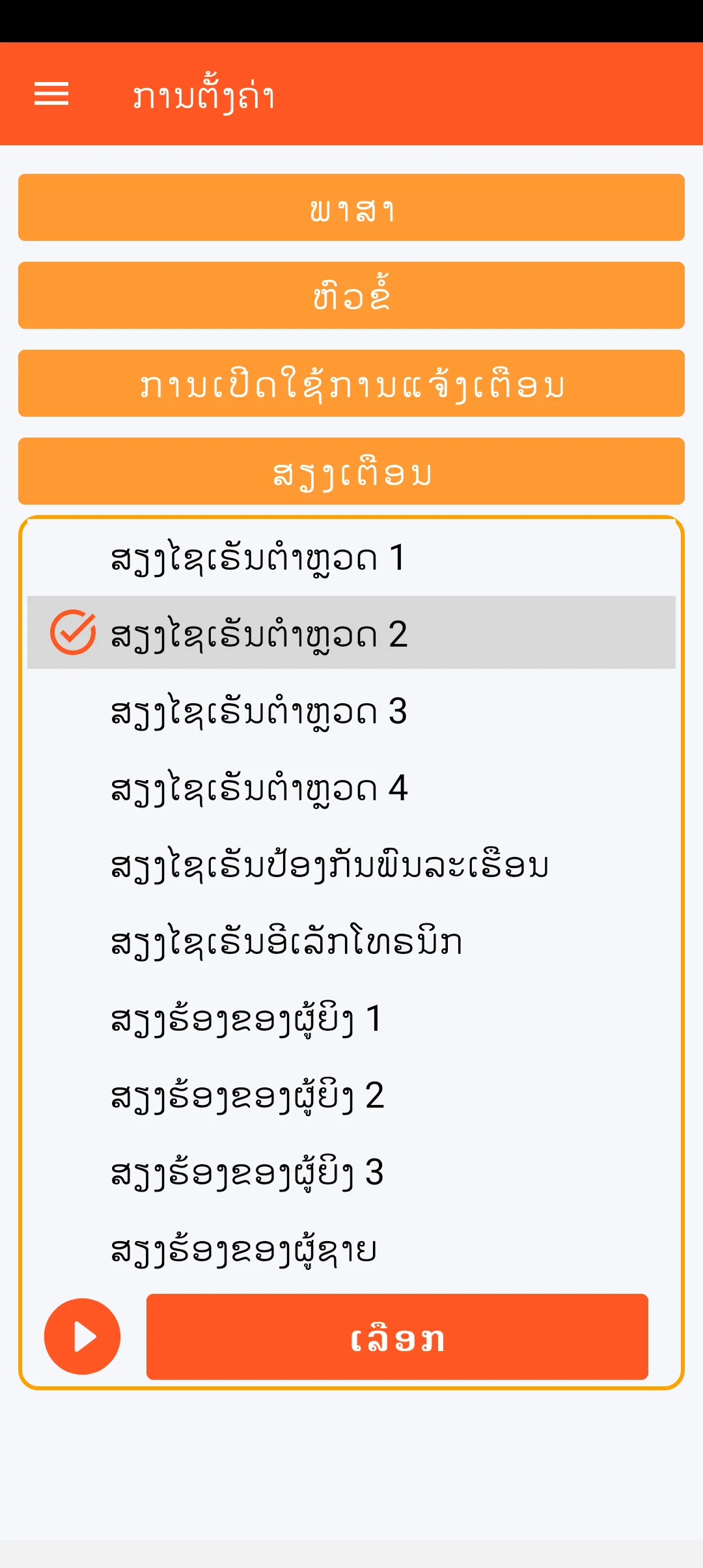 ສຳລັບການເລືອກສຽງເຕືອນ, ທ່ານມີ 6 ສຽງໄຊເຣັນ ແລະ 4 ສຽງຮ້ອງຂອງມະນຸດໃຫ້ເລືອກ.