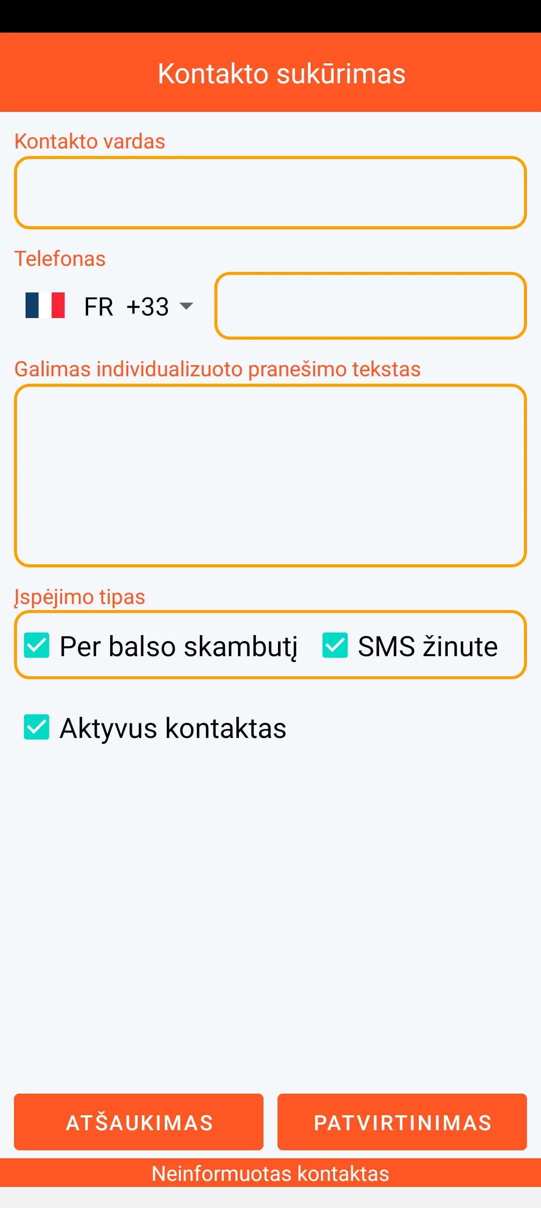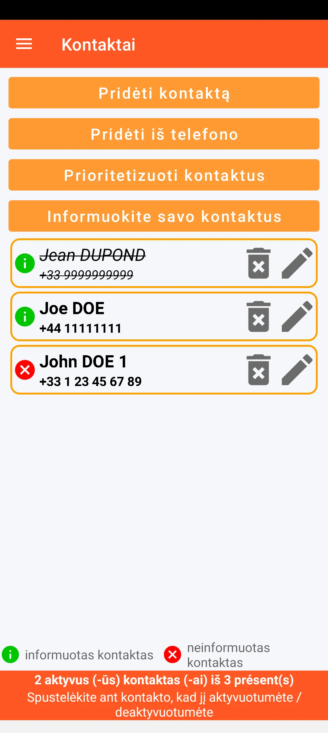 Galite nustatyti patikimus asmenis, kuriuos norite įspėti, naudodami išmaniojo telefono kontaktus. Šiems asmenims gali būti nustatytas prioritetas ir jie gali būti informuoti, kad gaus įspėjimo pranešimą. Kiekvienas kontaktas gali būti laikinai išjungtas.
