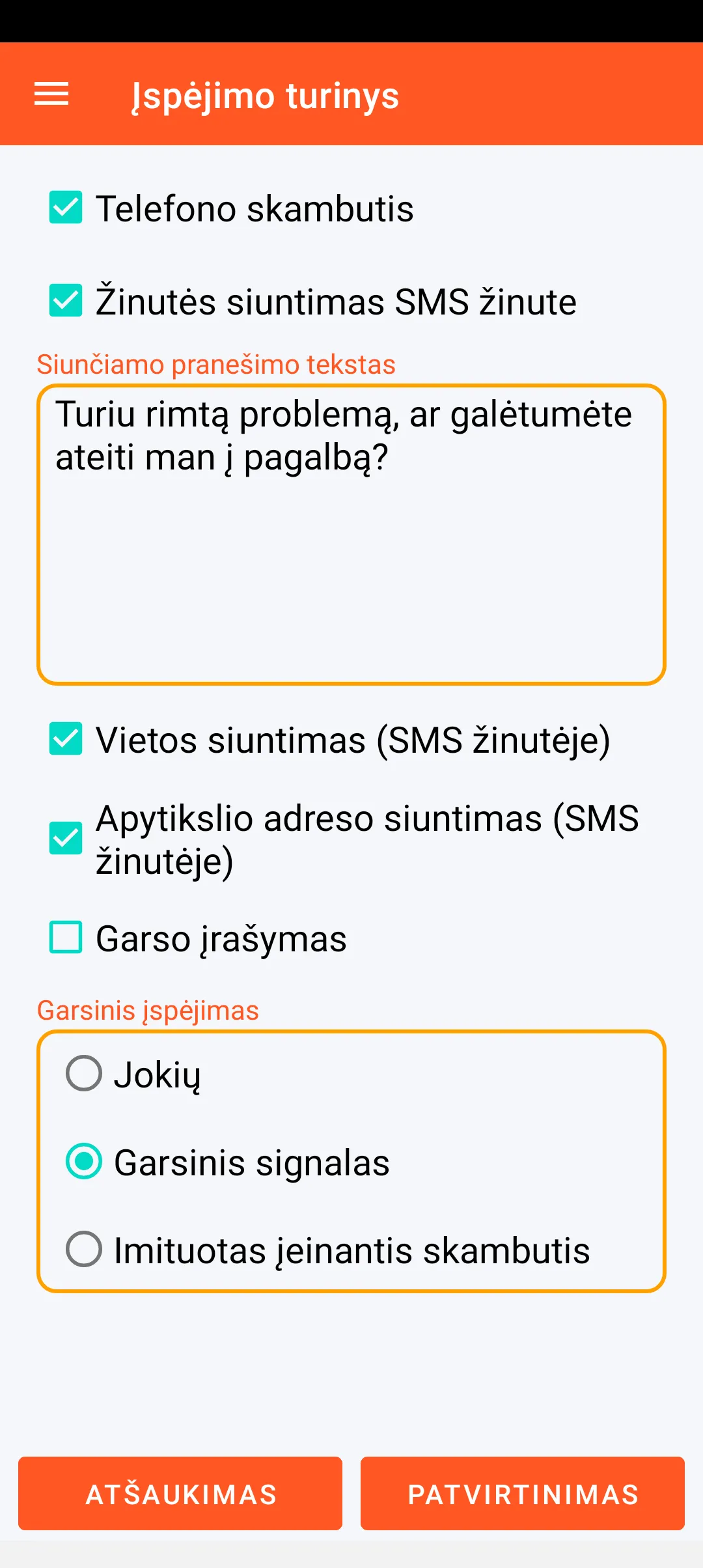 Įspėjimas gali būti nustatytas telefono skambučiu ir SMS žinute, kurioje gali būti (be pranešimo teksto) geografinė vieta (nuoroda į GoogleMaps arba OpenStreetMap žemėlapį) ir atitinkamas adresas. Šis įspėjimas taip pat gali sukelti garso įrašymą, garso signalą arba įeinančio telefono skambučio simuliaciją.