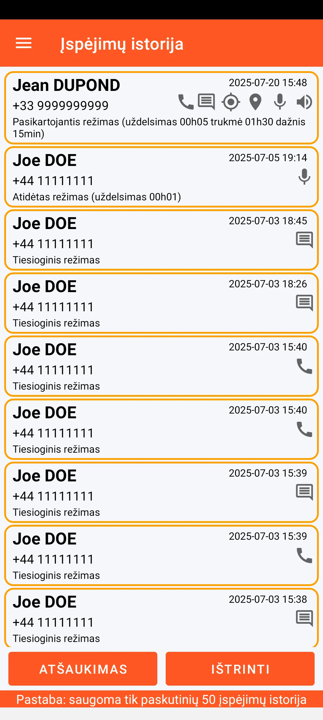 Paskutiniai 50 išsiųstų įspėjimų istorija saugoma su visomis jų savybėmis (įspėto kontakto vardas, data ir laikas, taip pat turinys ir įspėjimo režimas).