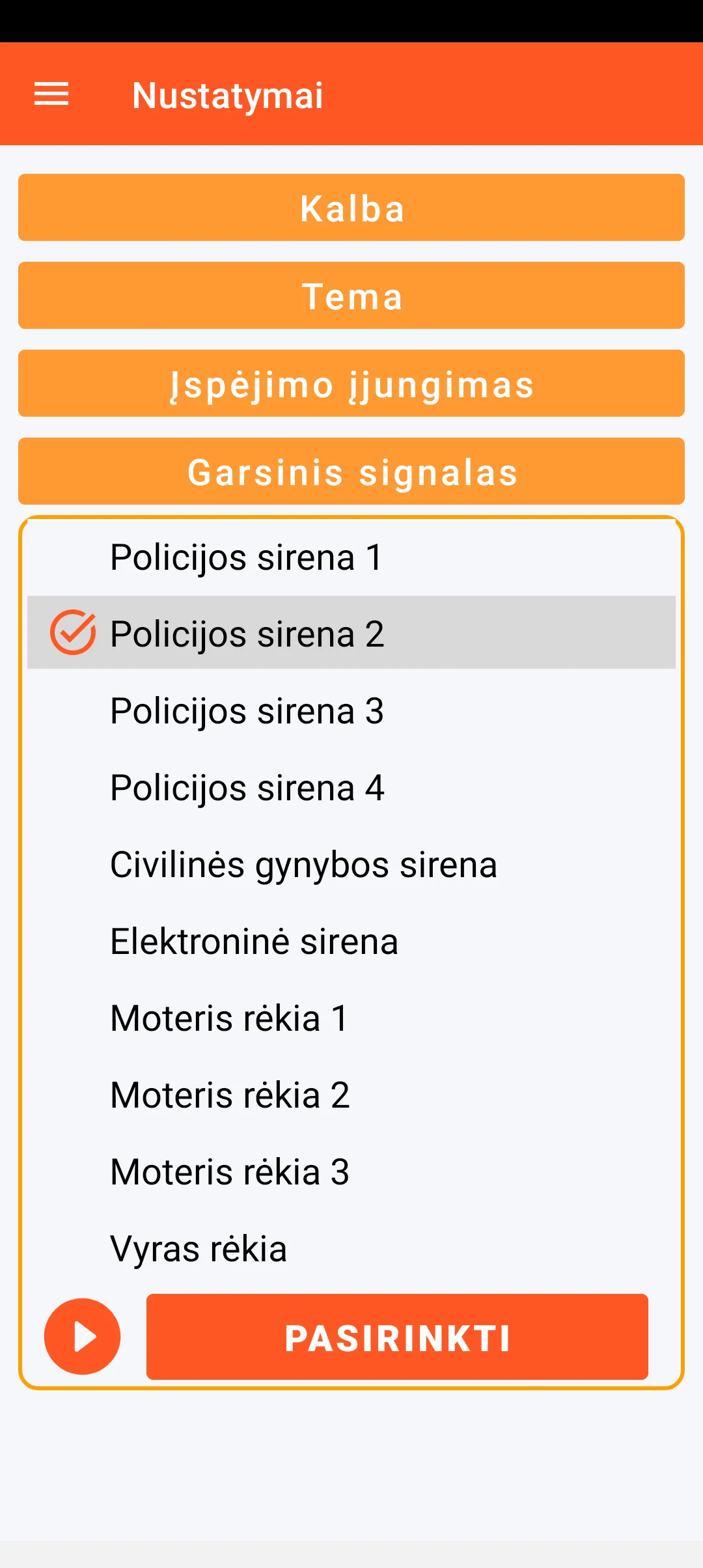 Kalbant apie garsinio signalo pasirinkimą, turite 6 sirenos įrašus ir 4 žmogaus klyksmo įrašus.