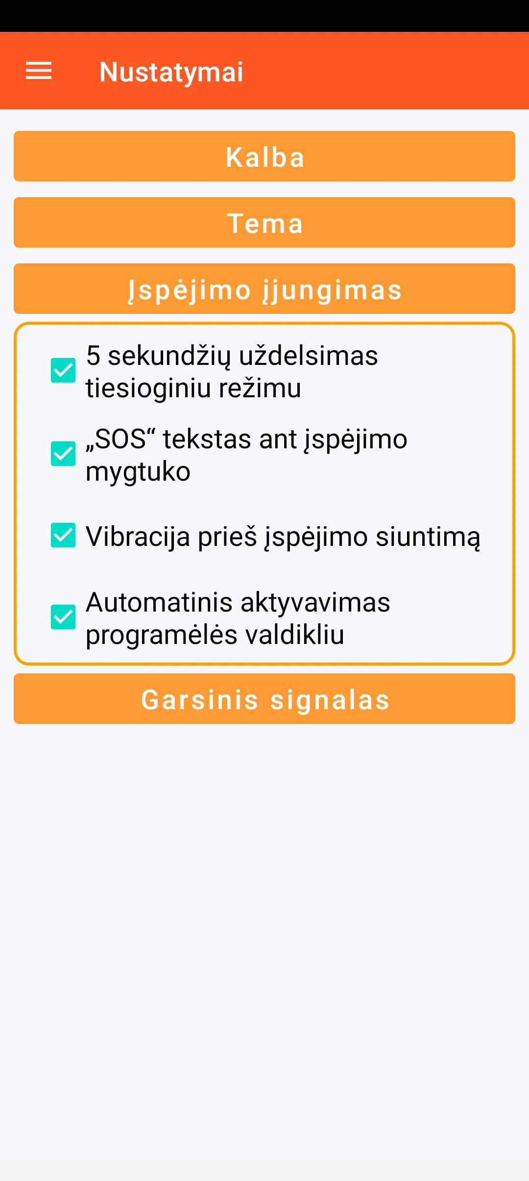 Taip pat galite atlikti įvairius nustatymus, susijusius su įspėjimo įjungimu (5 sekundžių delsą tiesioginiu režimu, teksto rodymą arba nerodymą ant įspėjimo mygtuko, galimą vibracijos išsiuntimą prieš įspėjimo išsiuntimą ir automatinį šio įspėjimo įjungimą iš programos valdiklio, tiesiai iš jūsų išmaniojo telefono pagrindinio ekrano).