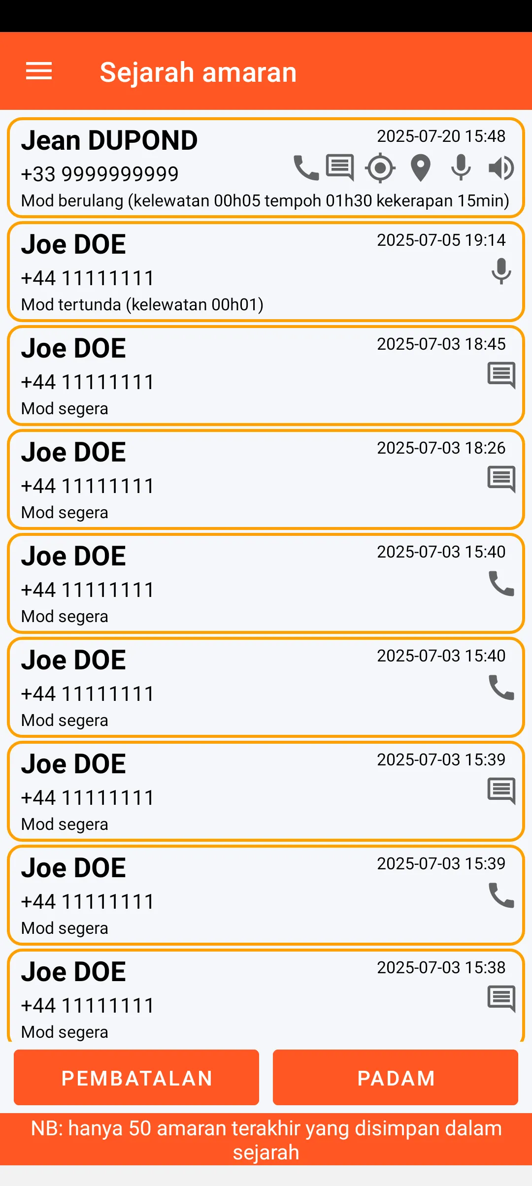 50 amaran terakhir yang dikeluarkan disimpan dalam sejarah dengan semua ciri-cirinya (nama kenalan yang dimaklumkan, tarikh dan masa serta kandungan dan mod amaran).