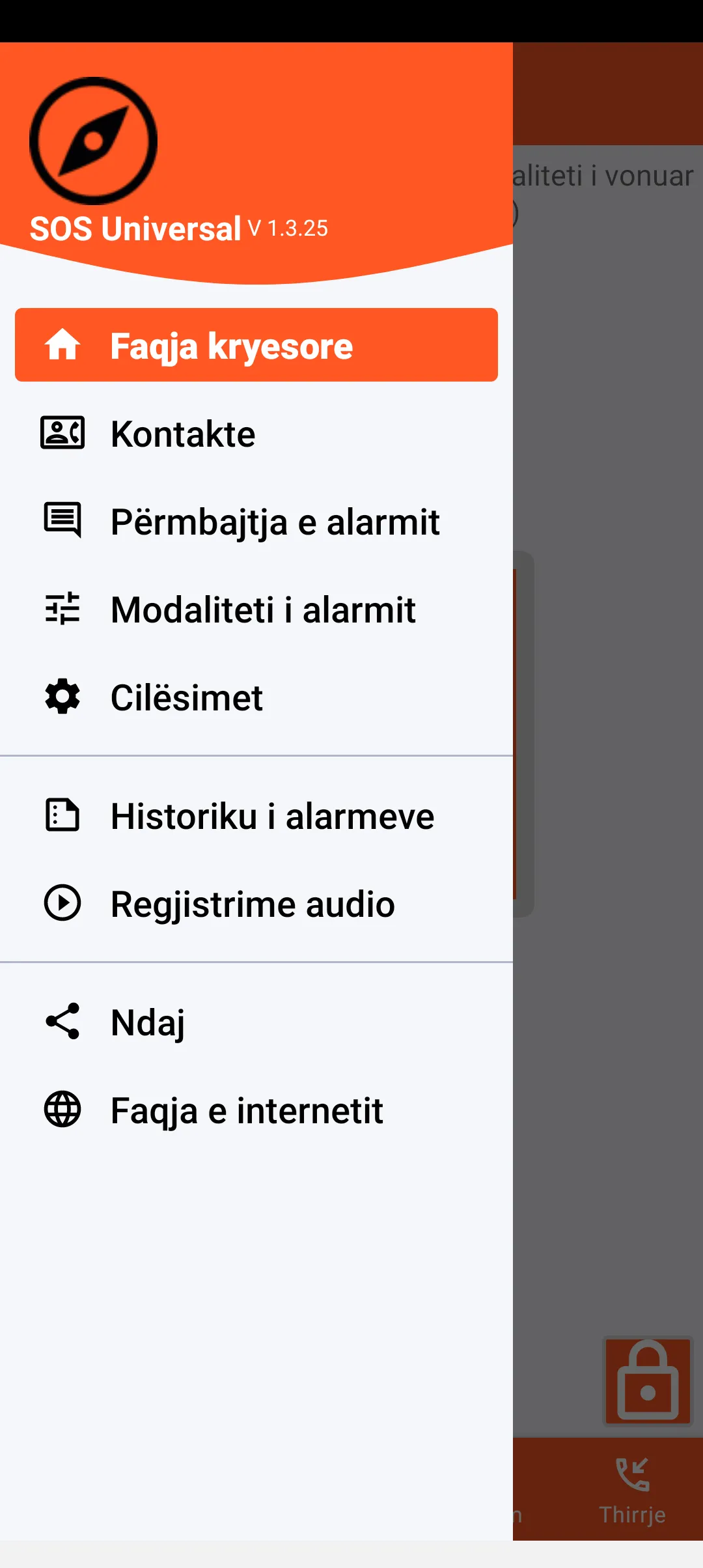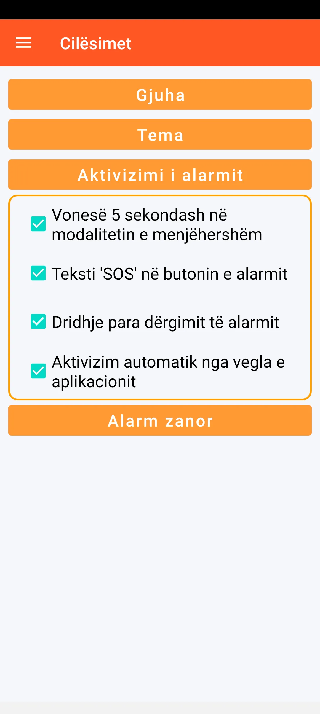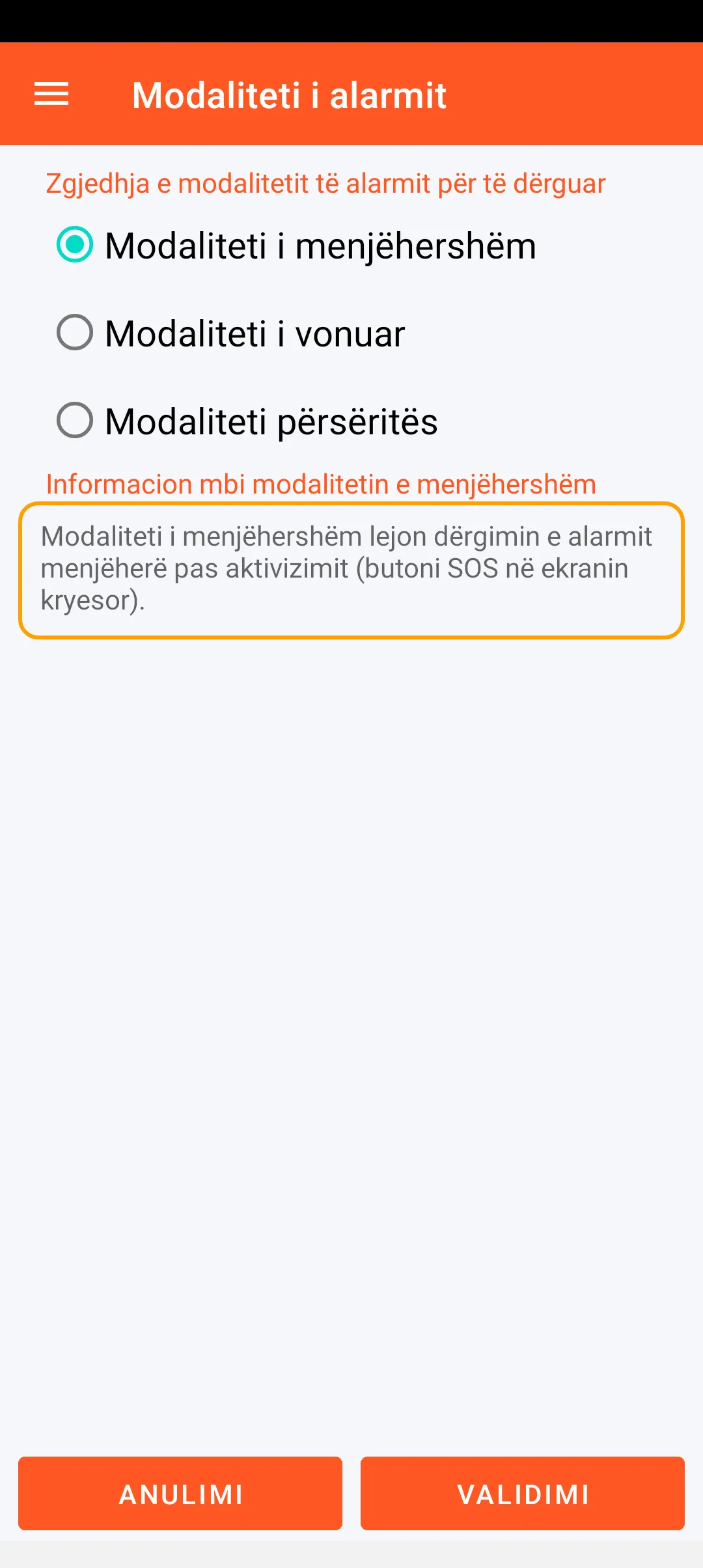 Modaliteti i menjëhershëm lejon dërgimin e alarmit menjëherë pas aktivizimit (butoni SOS në ekranin kryesor).