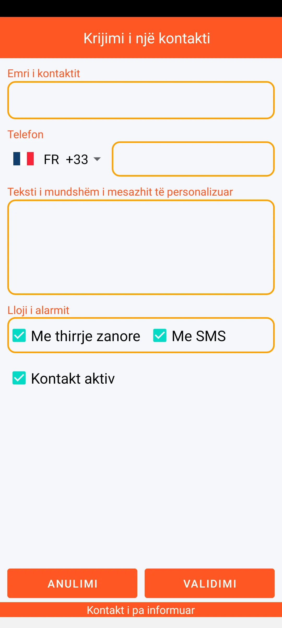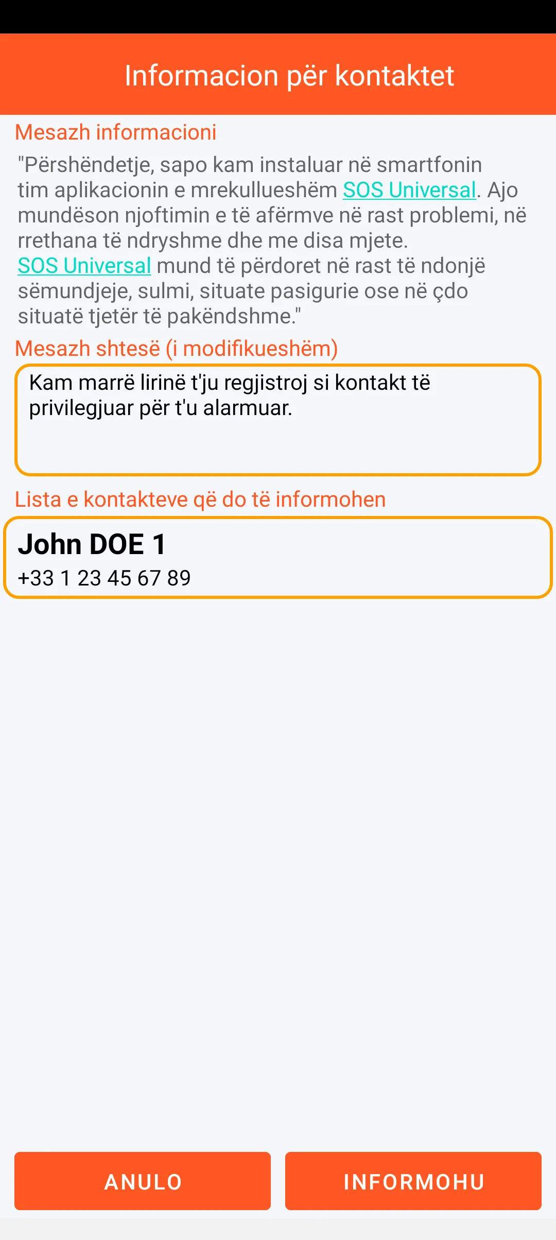 Mund të përcaktoni personat e besuar për t’u alarmuar nga kontaktet e pranishme në smartfon. Këta persona mund të priorizohen dhe informohen se mund të marrin një mesazh alarmi. Çdo kontakt mund të çaktivizohet përkohësisht.